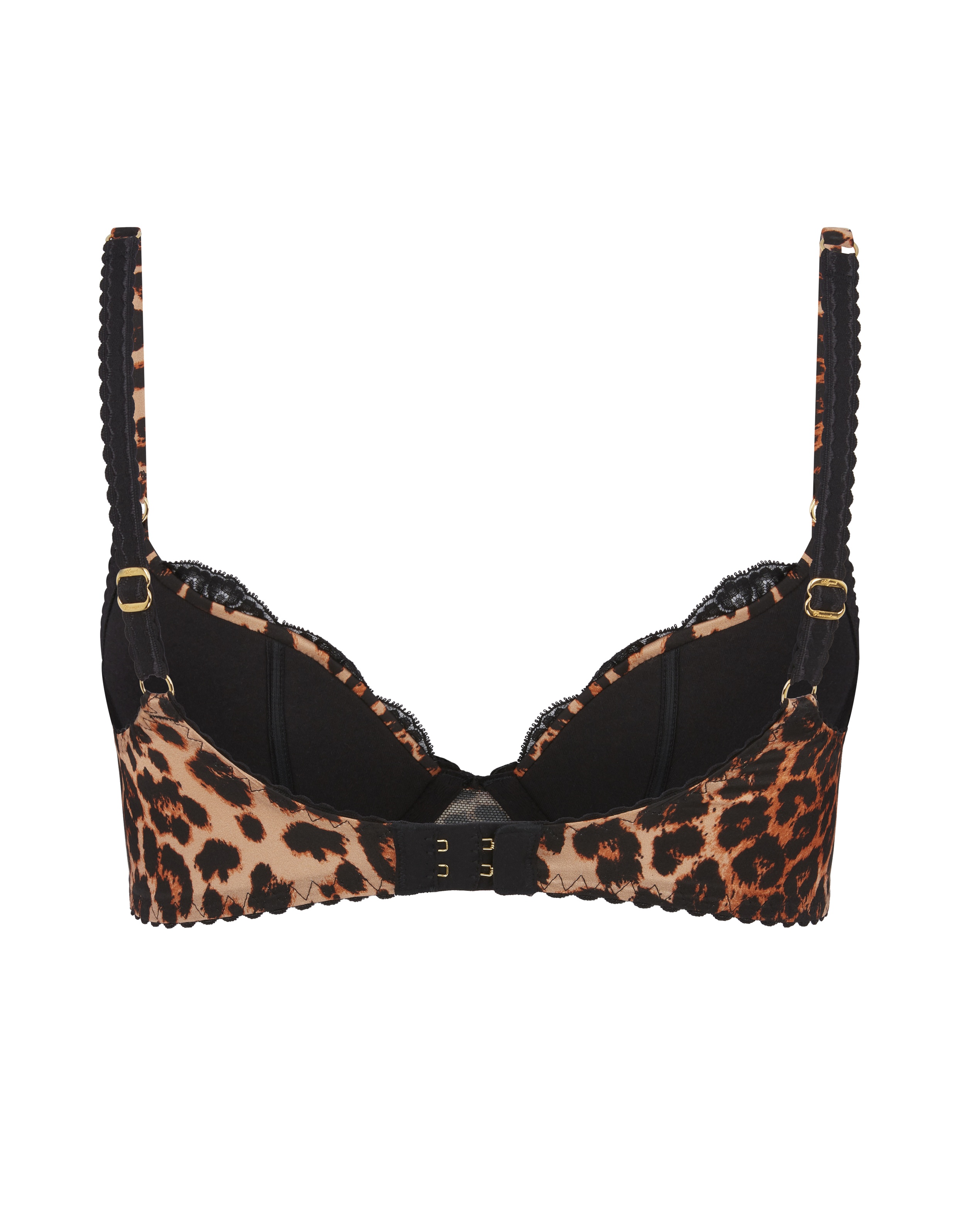 Для создания этой вариации бюстгальтера из коллекции Molly дизайнеры выбрали шелк с активным леопардовым принтом. Классический фасон с плотными чашечками дополнен лентой черного кружева по верху. Бретели крепятся на золотистые кольца и регулируются сзади с помощью фирменной фурнитуры.