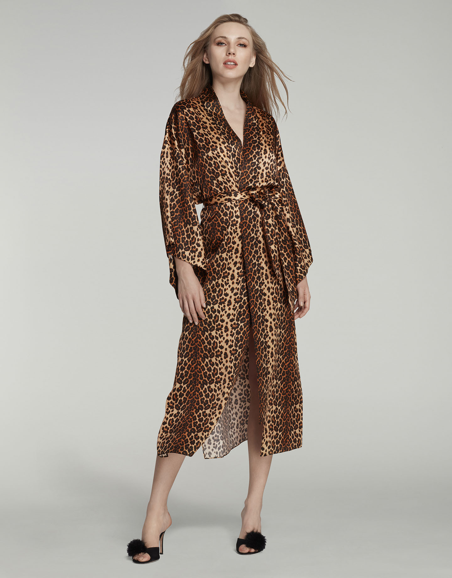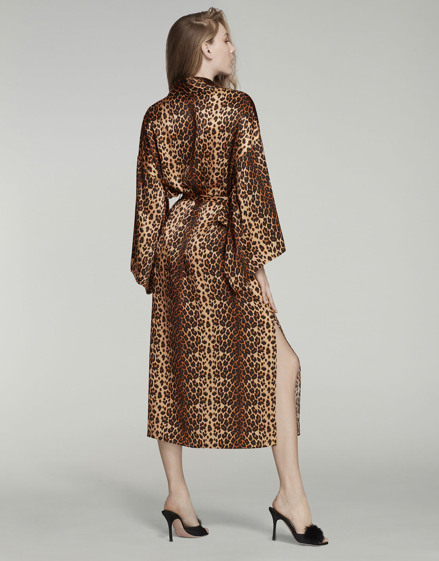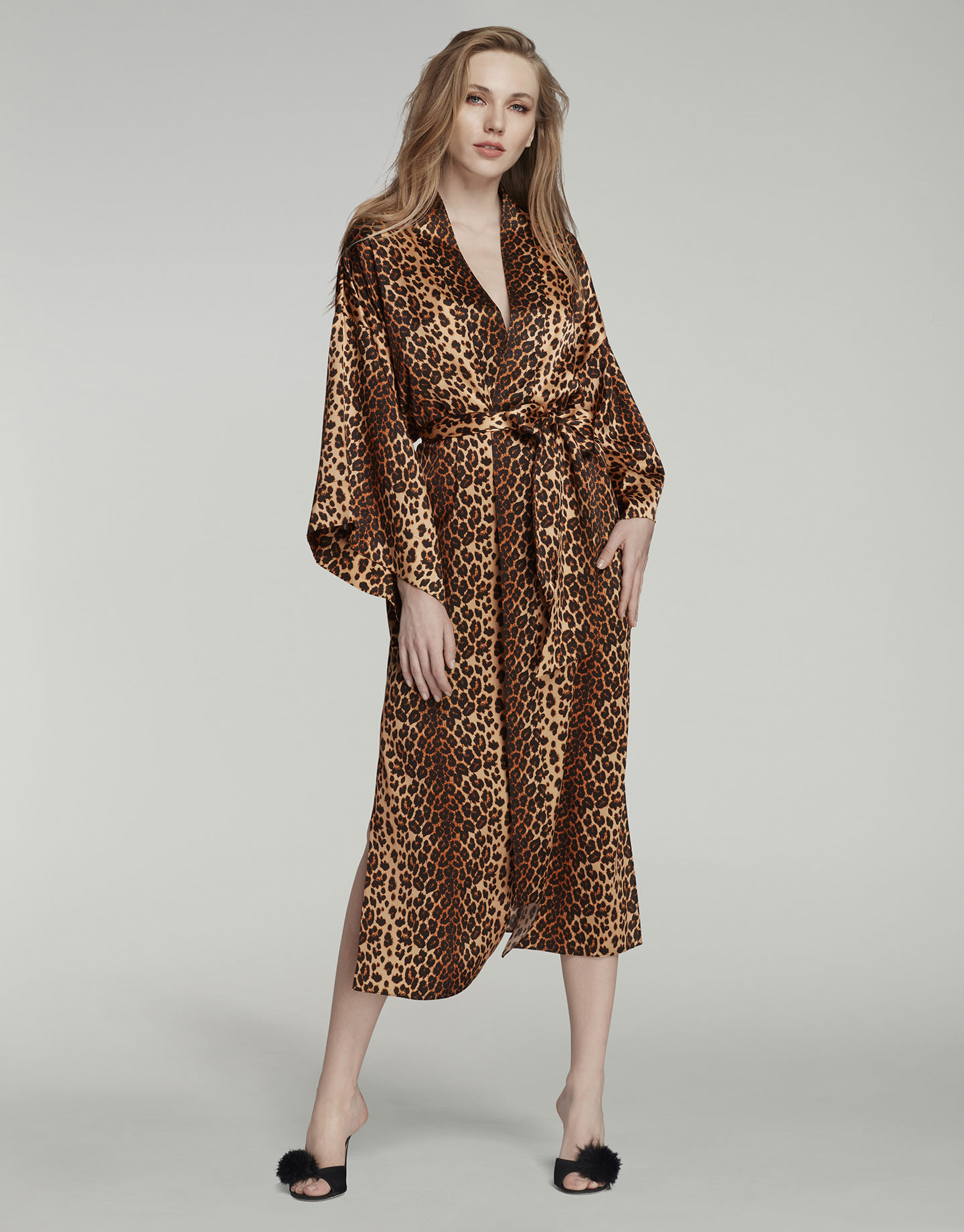 Халат-кимоно Kittie с широкими расклешенными рукавами сшит из атласного шелка с леопардовым принтом. Модель свободно обволакивает силуэт, акцентируя талию поясом. Идеальное завершение образа в стиле Agent Provocateur.