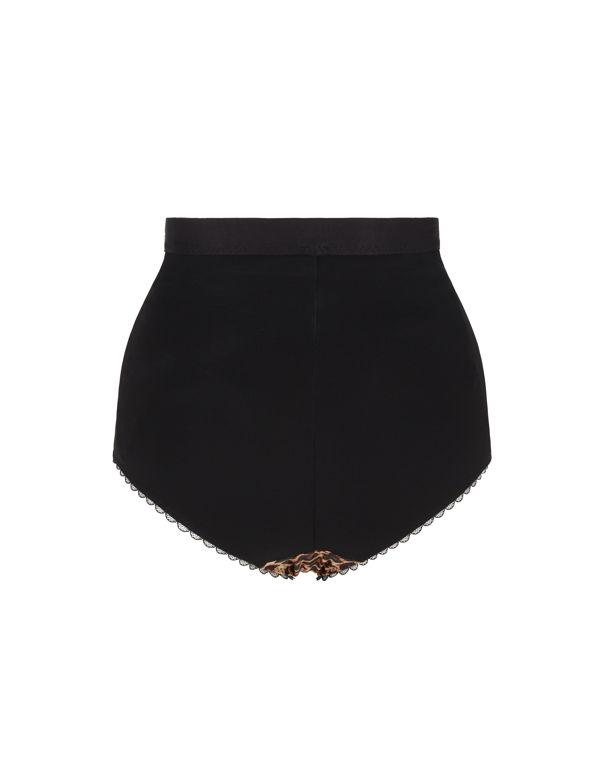 Высокие трусики Elora выполнены из эластичного шелка и вискозы. Передняя панель декорирована леопардовой вставкой. Традиционная линия бикини обработана резным эластичным кантом. Пояс дополнен классическим атласным бантом посередине. Для завершения образа сочетайте с топом из коллекции Elora.