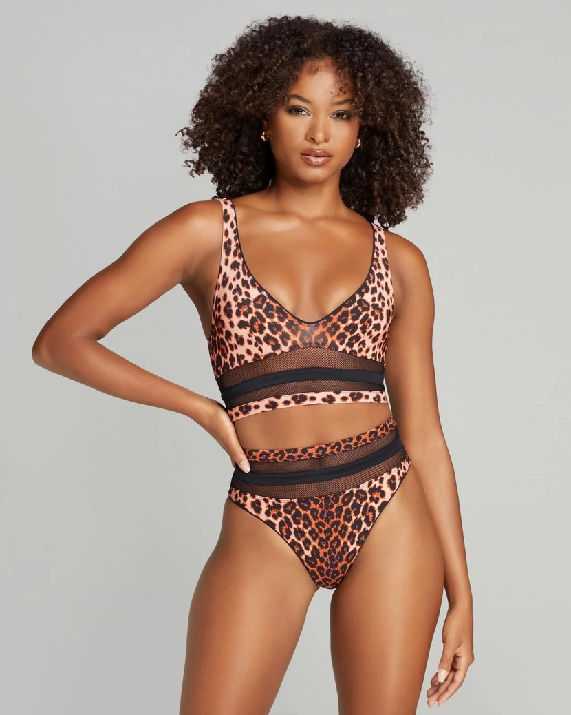 Леопардовые плавки купальника из коллекции Zenaya с высоким вырезом на ноге и черными сетчатыми вставками пошиты из итальянской эластичной ткани для плавания. Сочетайте плавки Zenaya с остальными элементами комплекта и создайте завораживающий образ.