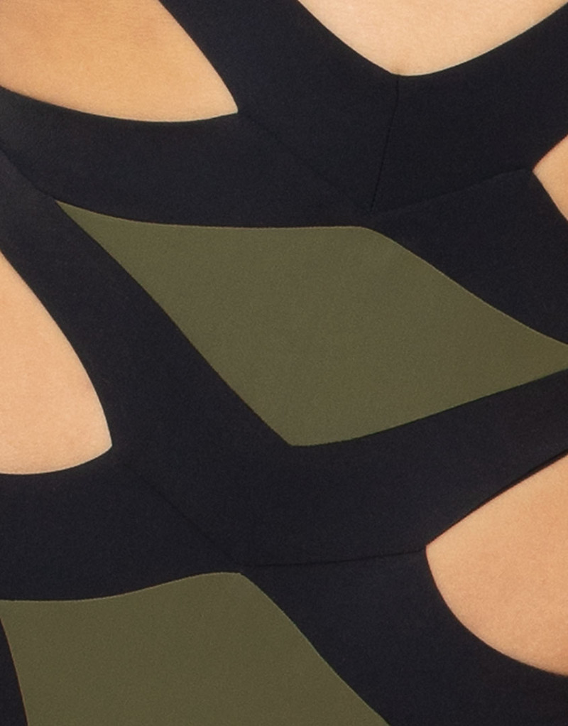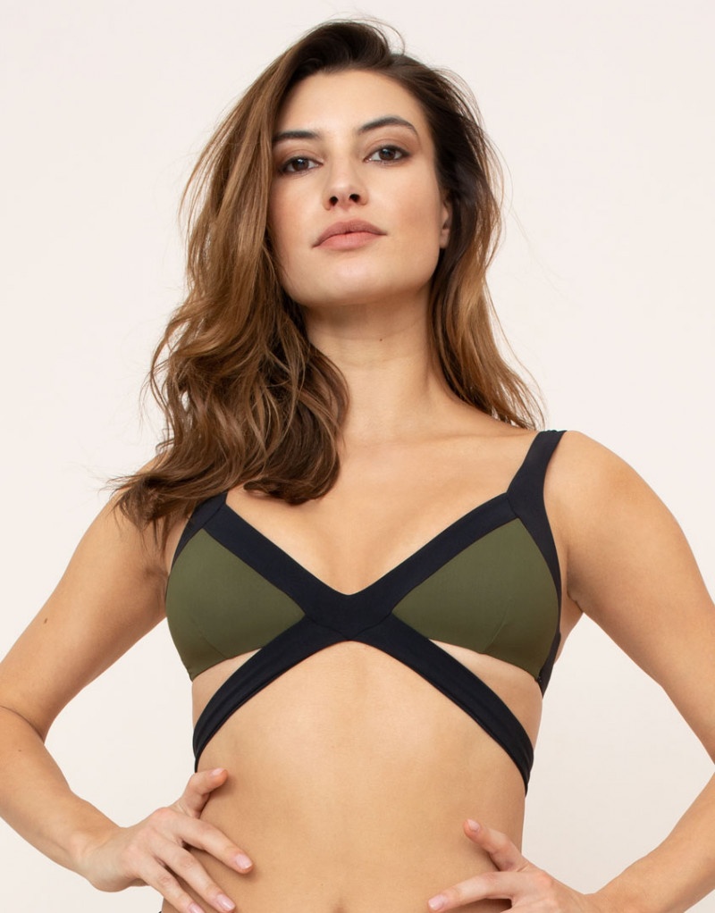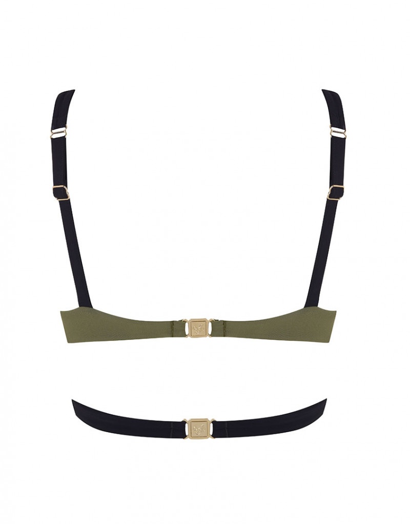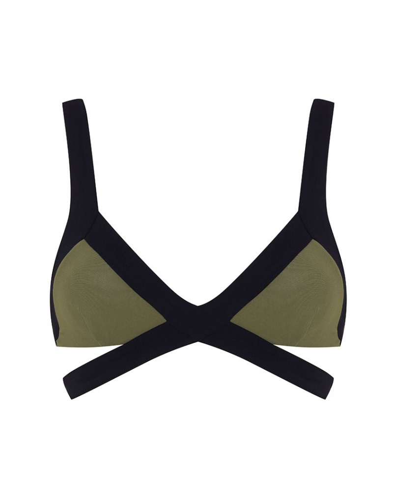 В нашем легендарном бикини Mazzy вас будут провожать взглядами на пляже. Бюстгальтер бикини цвета хаки с треугольными чашечками выполнен в бандажном стиле. Черные бретели, перекрещивающиеся под грудью, завершают образ. Подчеркнет любую фигуру.