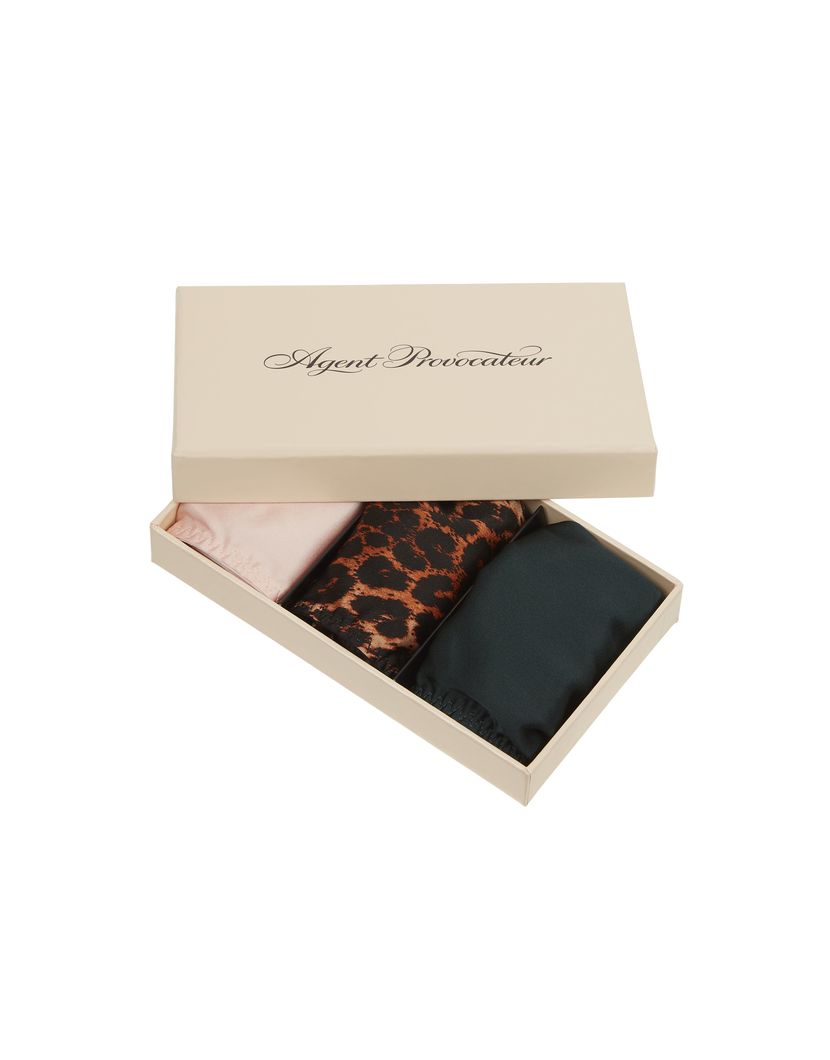 Сет из трех трусиков-стринг Fabi. Трусики сшиты из нежного стрейч-шелка в трех цветах - черном, светло-розовом и леопардовом. Гладкая ткань в сочетании с тонкими перемычками делают модель подходящей для носки под повседневную одежду или под вечернее платье.