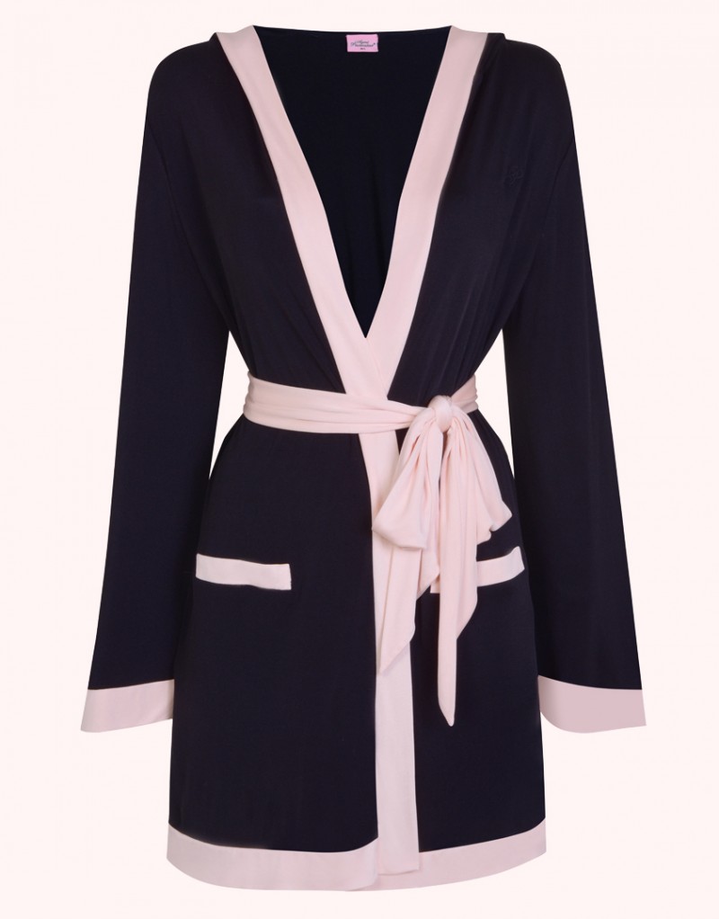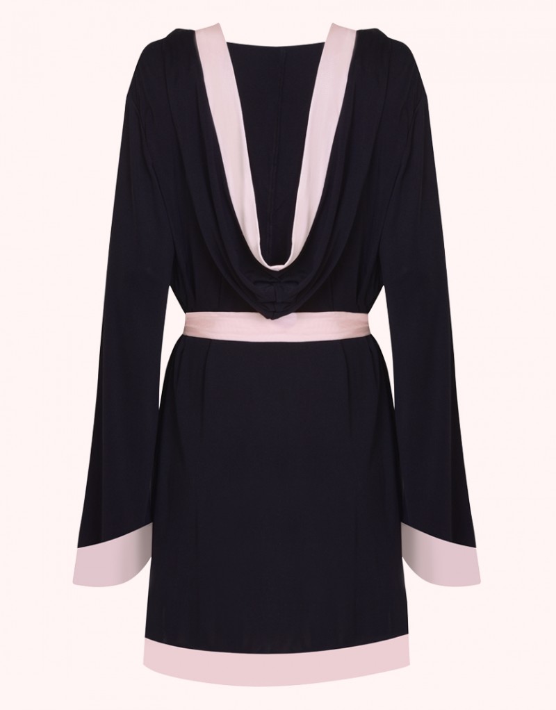 Maria – новый комплект пляжной коллекции, выполненный в знаковых цветах AP – черном и нежно-розовом. Очаровательный кокетливый халат с капюшоном в стиле ранних 30-х годов из мягкой ткани джерси прекрасно подойдет для любой фигуры.   Вышивка с логотипом AP слева на груди, силуэт кимоно с широкими рукавами и контрастная оторочка нежно-розового цвета по краю и на карманах завершает образ. Халат имеет мягкий широкий пояс.