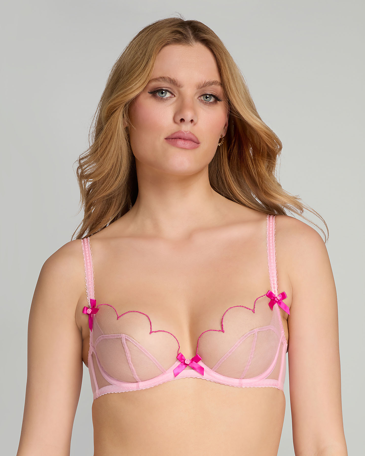 Нежно-розовый бюстгальтер с мягкой чашкой Lorna изготовлен из прозрачного тюля. Фурнитура с покрытием из настоящего золота добавляет роскошный штрих. Трехчастные чашки обеспечивают поддержку и подъем. Края украшены швейцарской вышивкой в малиновом цвете. Атласные бантики с миниатюрными розочками завершают образ. Сочетайте с остальными изделиями из коллекции Lorna для создания классического образа.