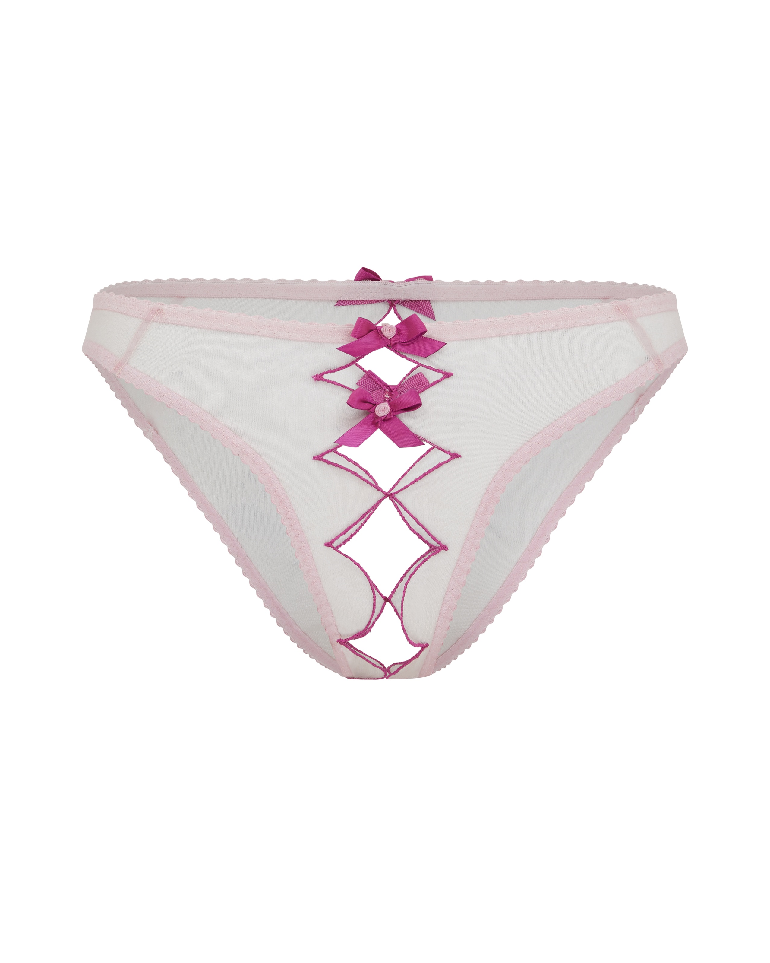 Французские трусы Lorna нежно-розового цвета имеют открытую ластовицу. Основа из прозрачного тюля с малиновыми зубчатыми краями и швейцарской вышивкой. Изящная французская отделка швов. Носите с другими элементами коллекции Lorna для потрясающего провокационного образа.