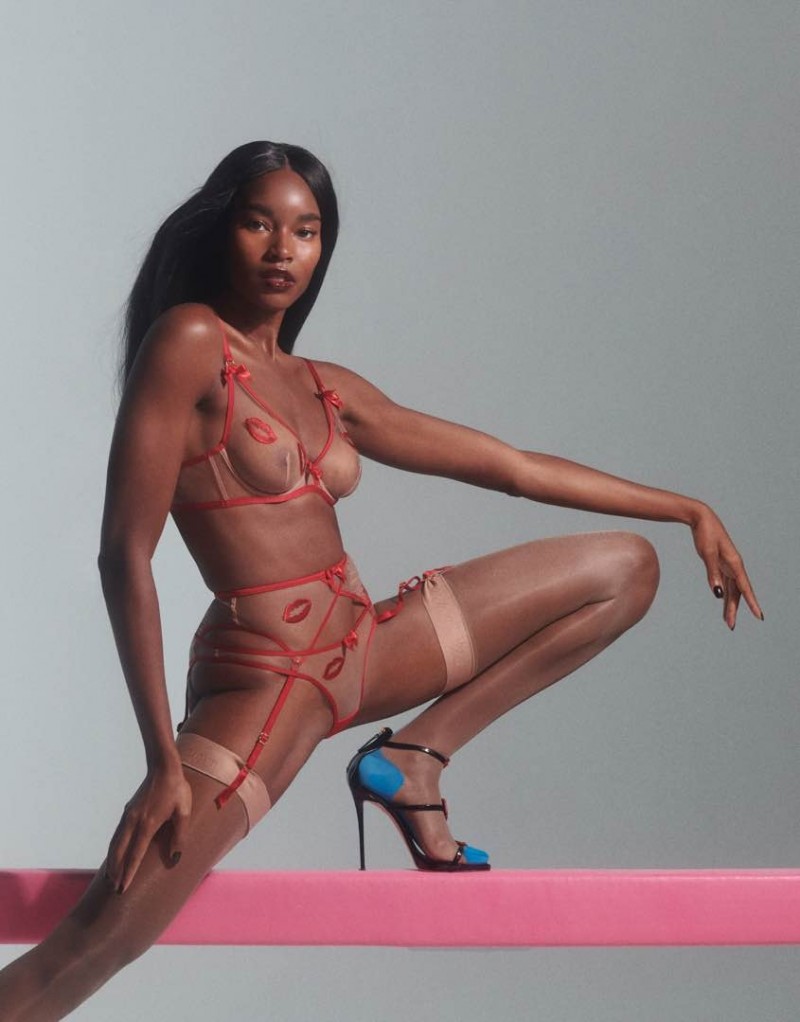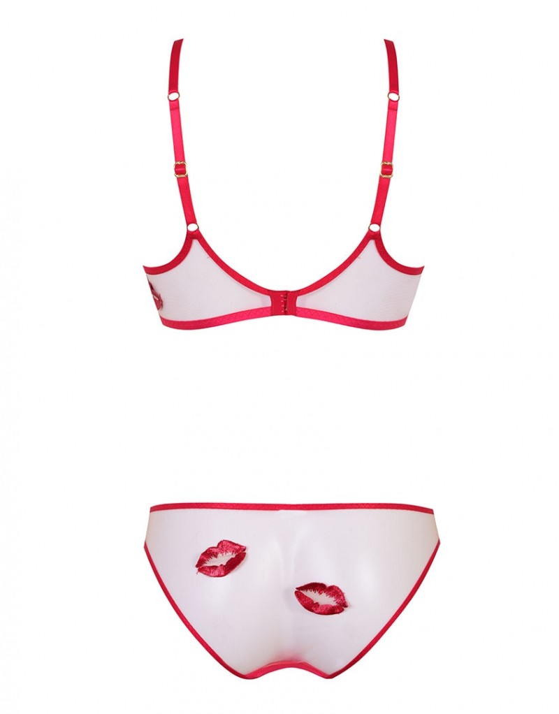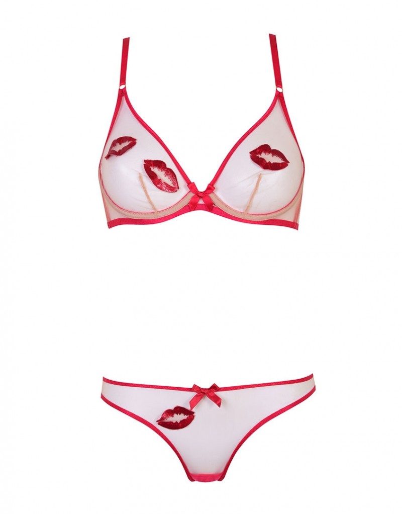 Бюстгальтер выполнен из тонкой полупрозрачной ткани с окантовкой и бретелями насыщенного красного оттенка. Модель украшена сатиновыми бантиками и вышивкой в виде игривых поцелуев.