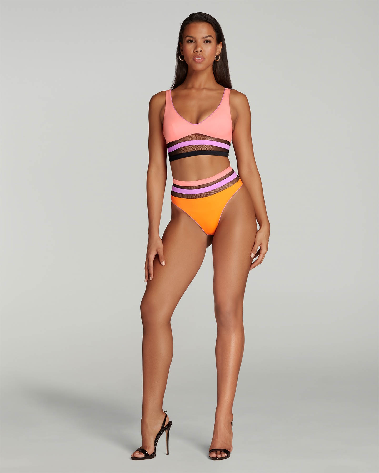 Для пошива плавок Zenaya была выбрана специальная эластичная ткань из Италии, используемая для плавания. Модель в спортивном стиле с высокой талией. Контраст ярких полос кораллово-розового, сиреневого и оранжевого цветов с мягкой черной сеткой создает привлекательный и эффектный образ. Сочетайте с топом с V-образным вырезом или топом бандо из этой же коллекции.