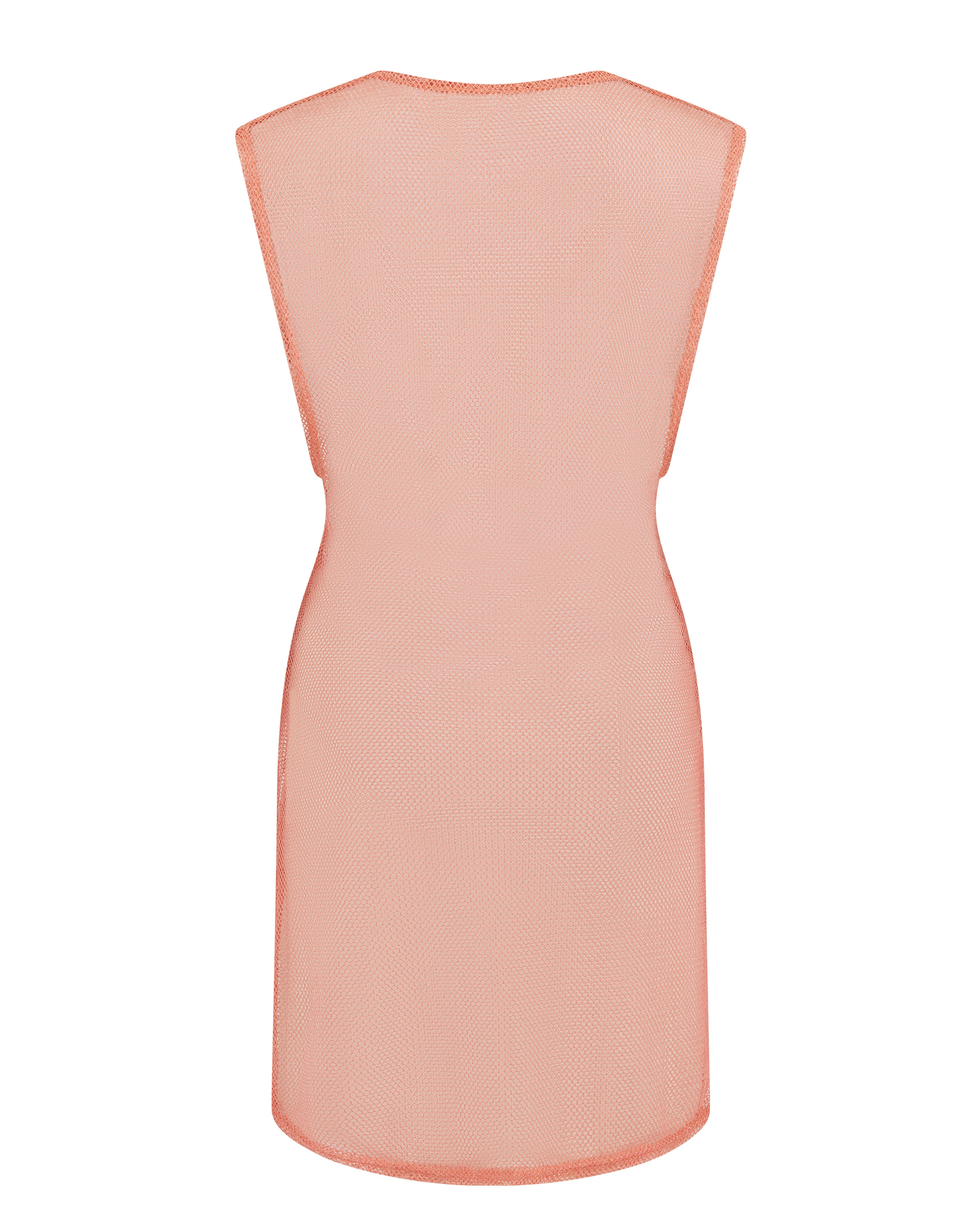 Пляжное платье Orina нежного персикового цвета выполнено из легкой прозрачной сетчатой ткани с мерцающими металлизированными нитями. Асимметричная деталь со сборкой с одной стороны и дерзким разрезом до бедра. Застежки не требуются — просто наденьте и готово. Дополните свой пляжный образ.