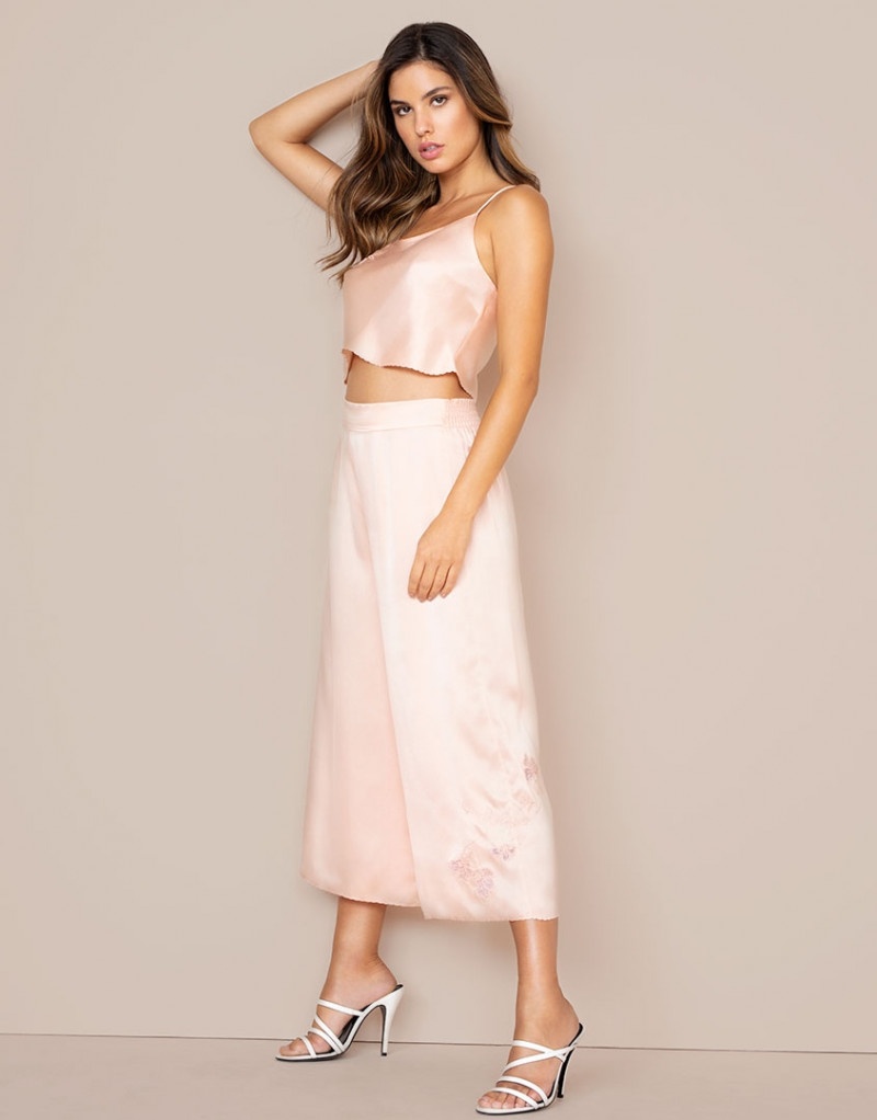 Поддайтесь романтическому настроению вместе с Edenn - роскошной коллекцией из мягкого нежно-розового шелка. Пижамные брюки с высокой посадкой и широкими укороченными штанинами создают свободный силуэт. Модель дополнена эластичной резинкой сзади на талии для дополнительного комфорта. Сочетайте c пижамным топом и кимоно Edenn.