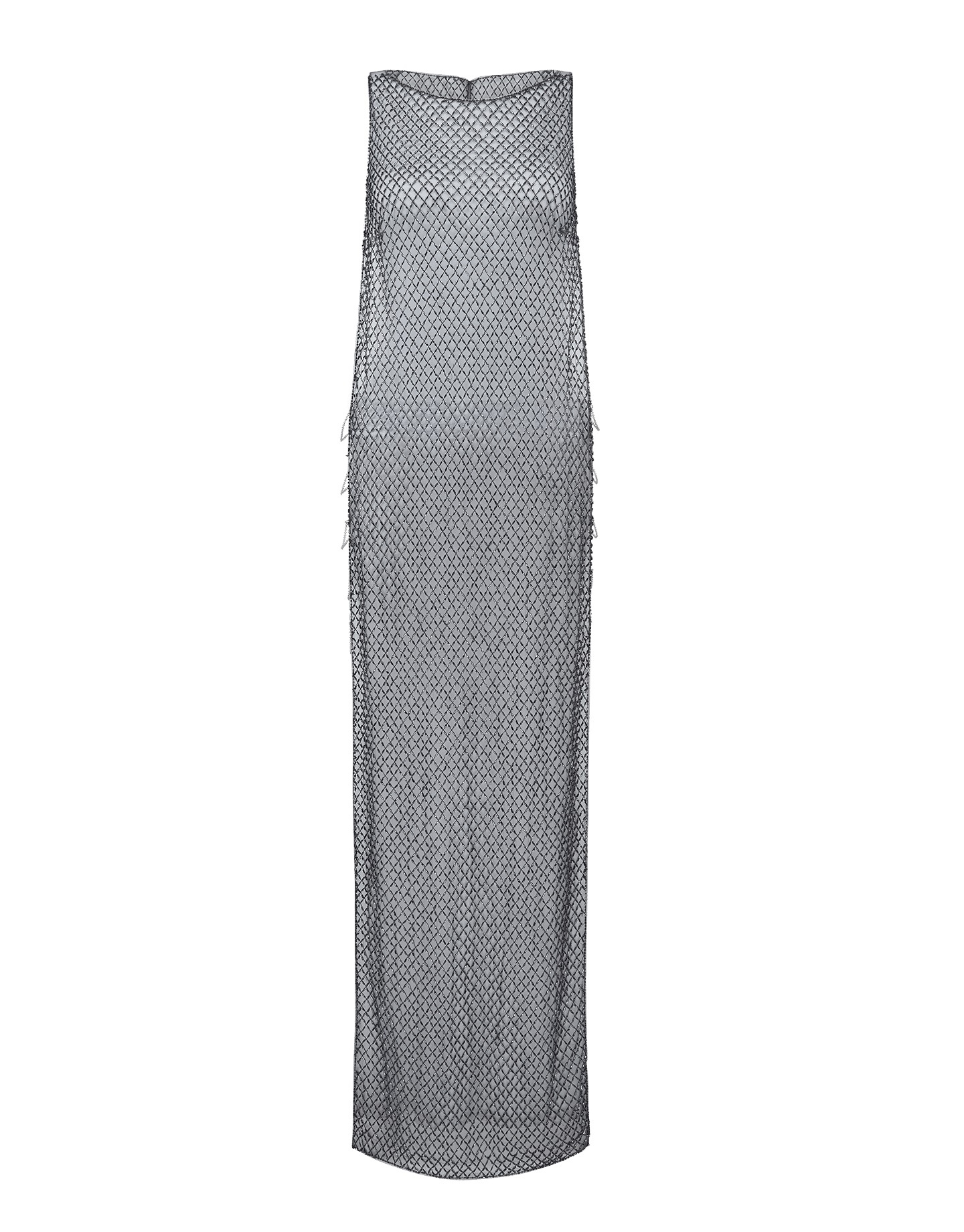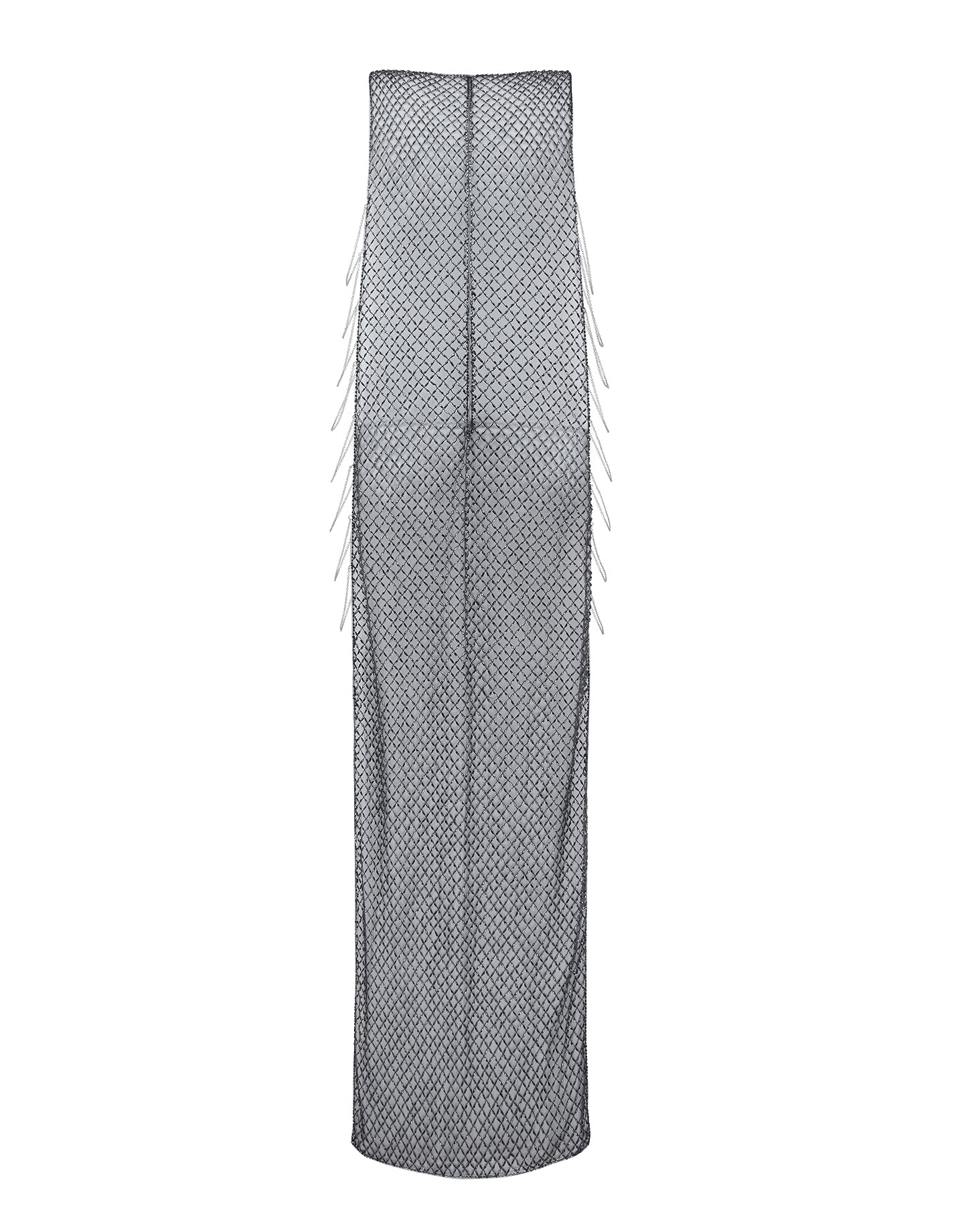 Создайте образ, достойный красной ковровой дорожки в платье Chrystelle. Платье макси с разрезами по бокам, соединенными тонкими цепочками, сшито из полупрозрачной сетки с вышивкой сверкающими бусинами.