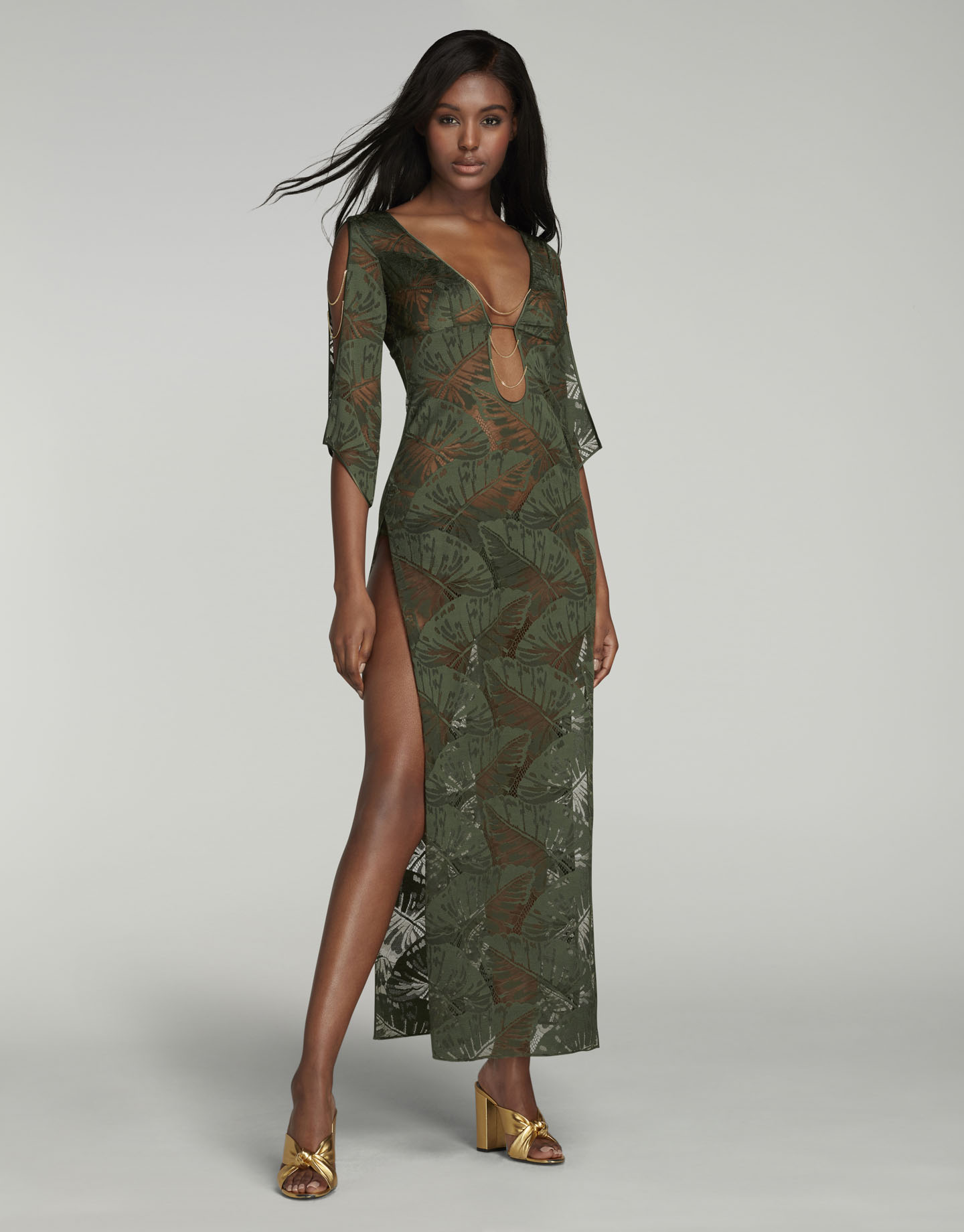 Тонкое, полупрозрачное платье Eileen станет прекрасным вариантом пляжной одежды, а также подойдет в качестве вечернего платья для вечеринки у бассейна. Модель выполнена из кружева с тропическим узором и украшена золотистыми цепочками на декольте и на рукавах. Лиф дополнен незаметными чашечками для поддержки груди, а сбоку предусмотрена потайная молния.