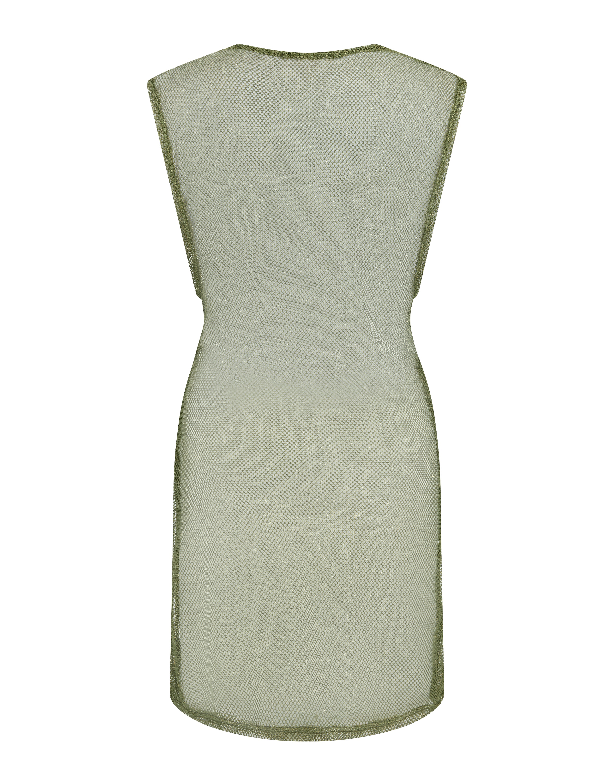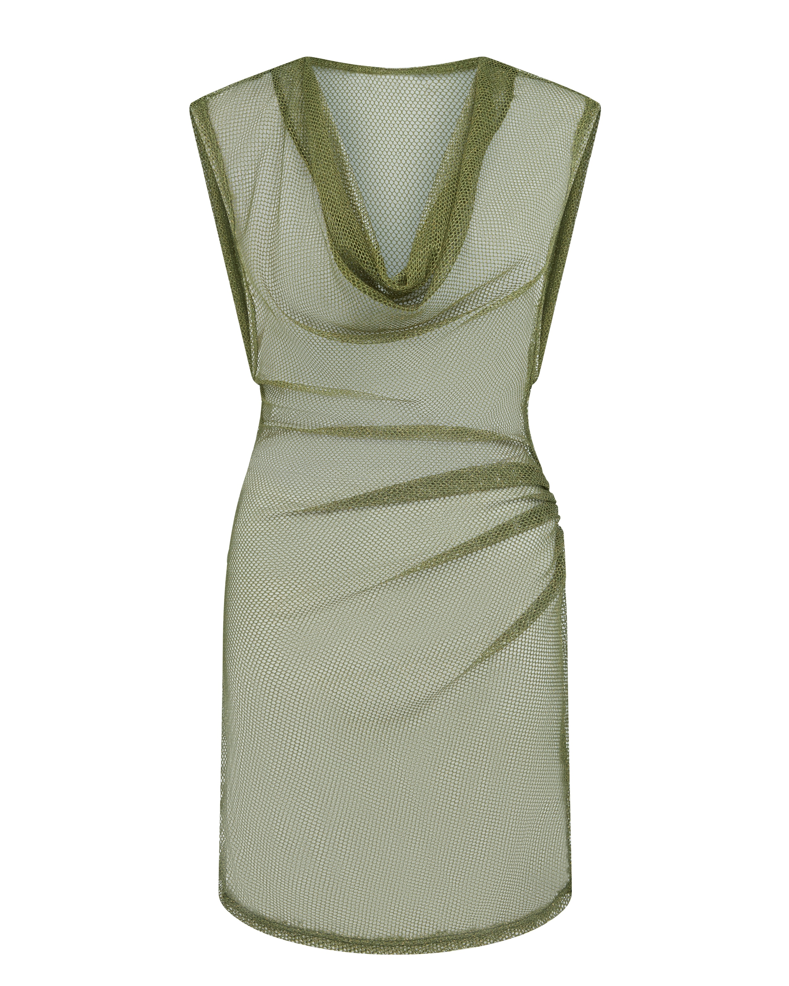 Пляжное платье Orina в насыщенном цвете хаки создано из легкой прозрачной сетчатой ткани с мерцающими металлизированными нитями. Асимметричная деталь со сборкой и смелым разрезом, обнажающим бедро. Наденьте и будьте готовы покорять пляж.