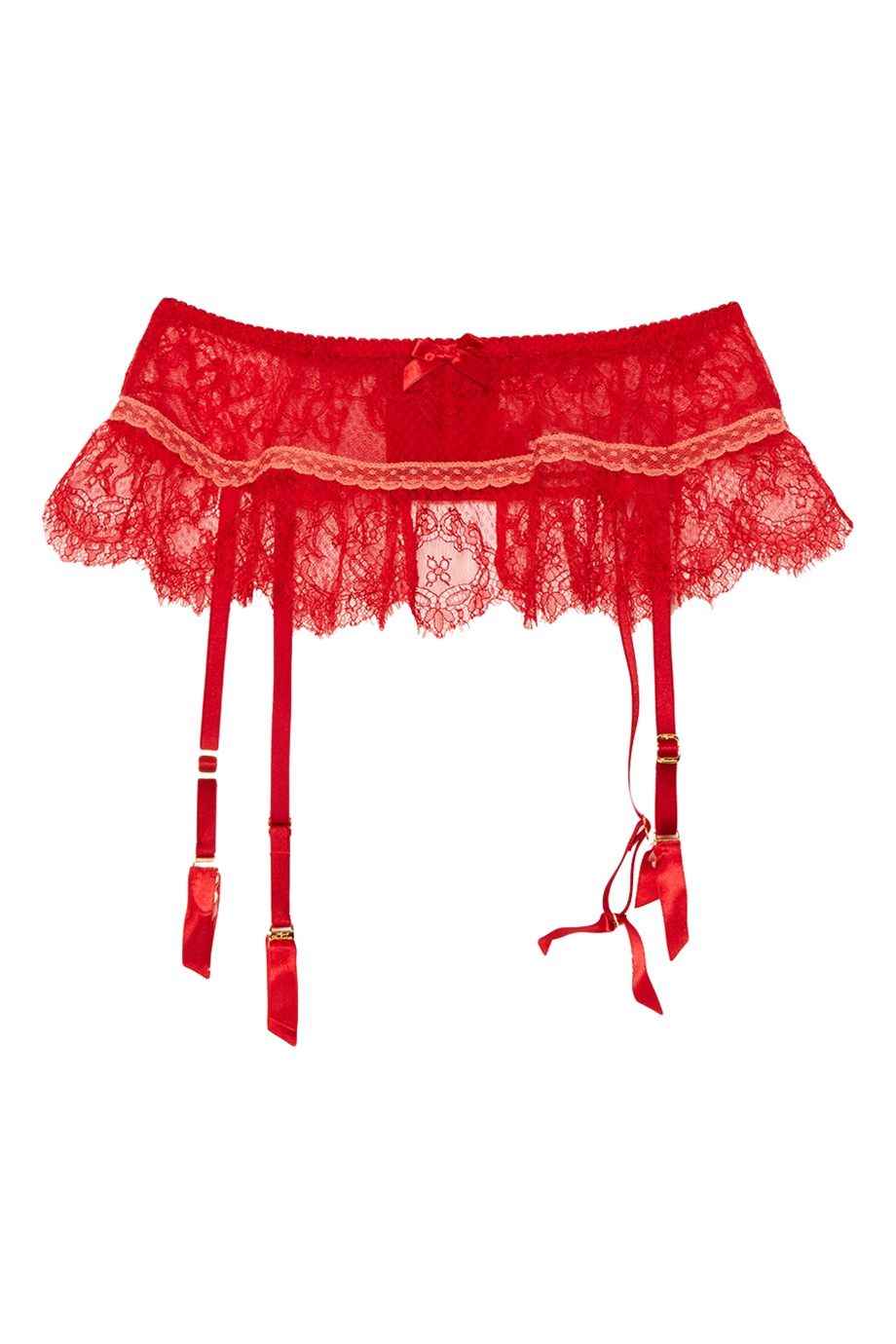 Новая кружевная коллекция Alannah сделает каждый день незабываемым. Кокетливый пояс из двуслойного красного кружева с цветочной вышивкой украшен игривой нежной оборкой с поперечной бледно-розовой лентой. Красный бантик на талии и шелковые пажи завершают образ.
