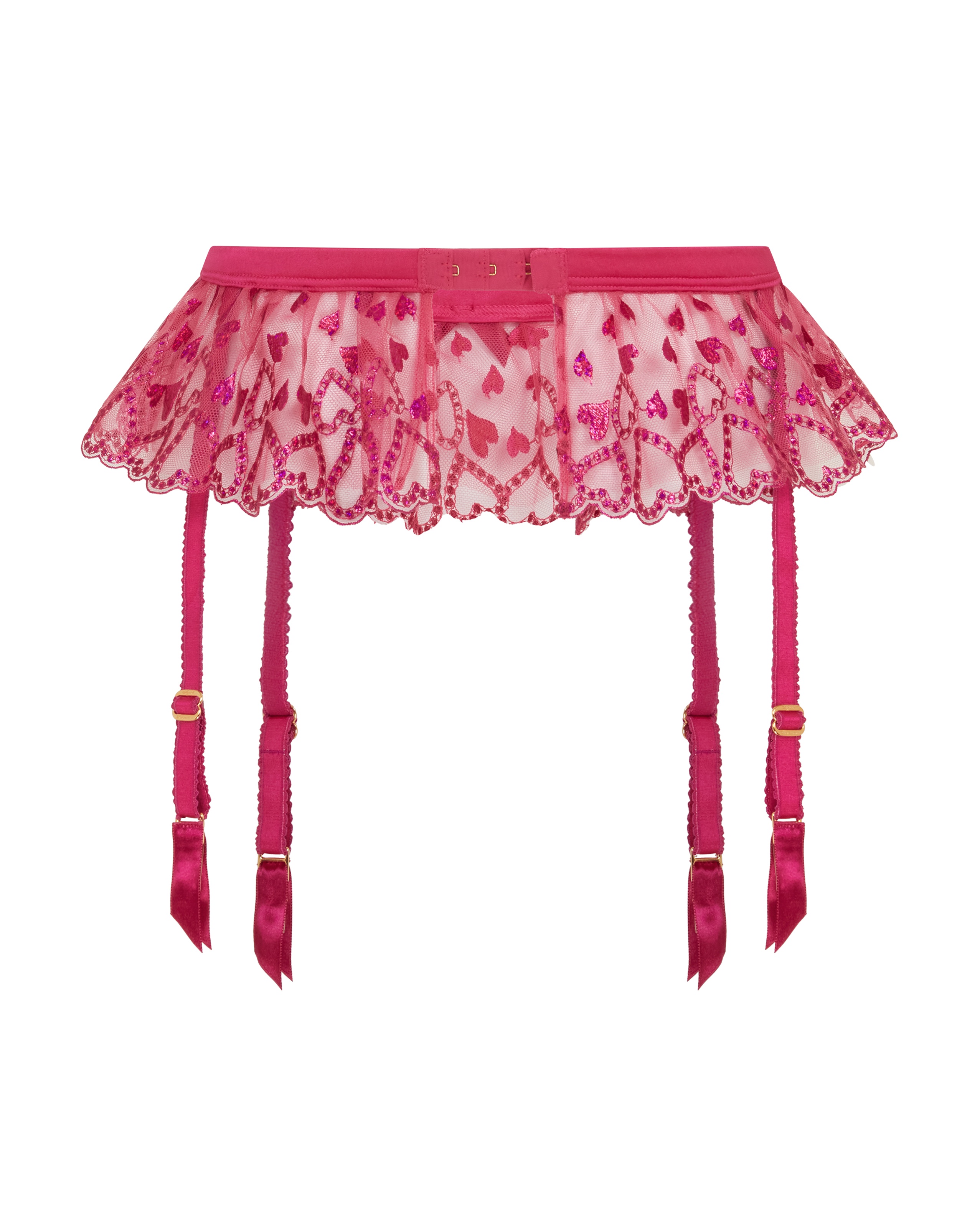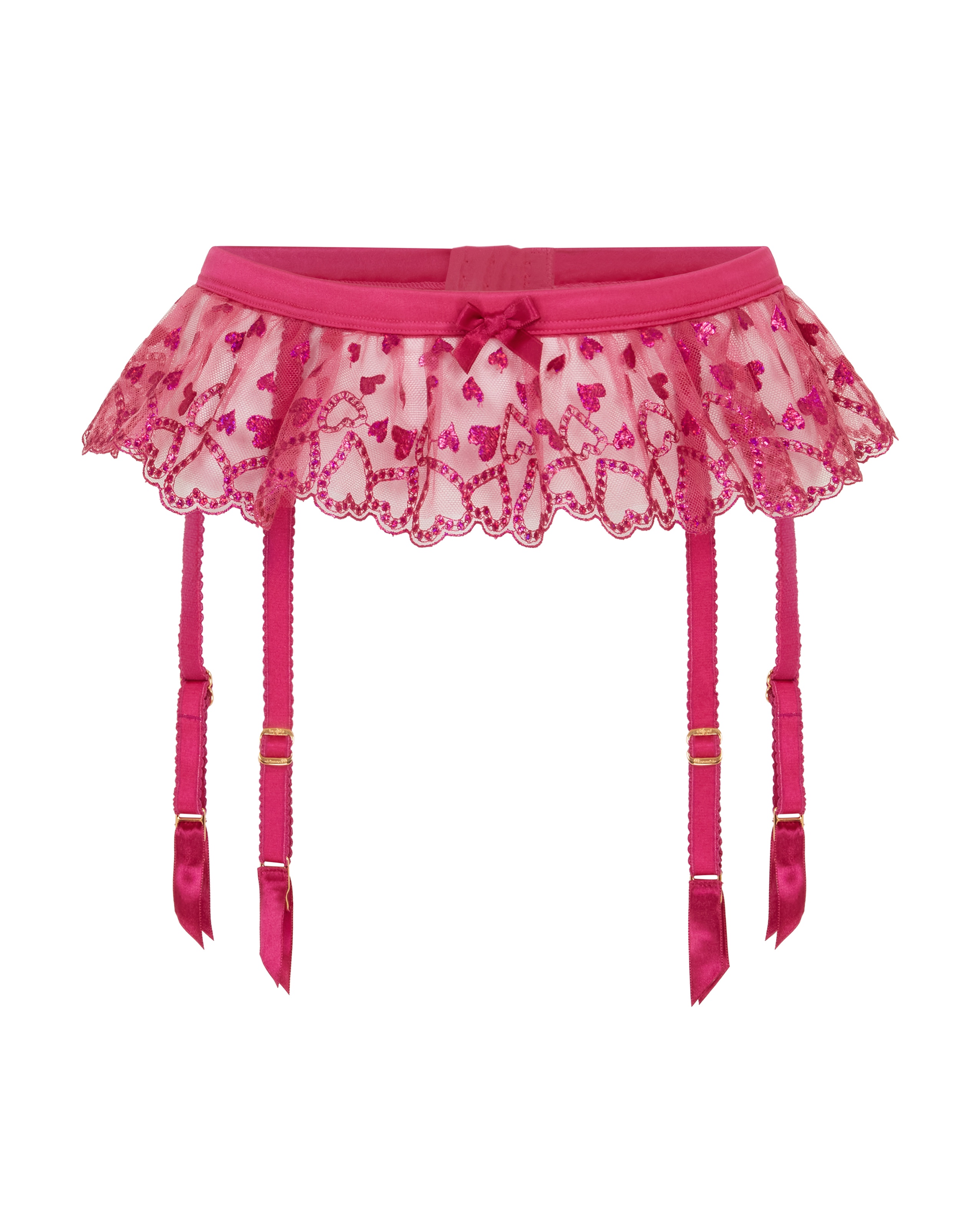 Пояс для чулок Rozann цвета фуксия в стиле 80-х подчеркивает талию. Слои тюля и вышивка в форме сердечек добавляют объем. Эластичный пояс и регулируемые подвязки с ажурным краем обеспечивают идеальную посадку. Аксессуар, который привносит игривый шарм в любой образ.