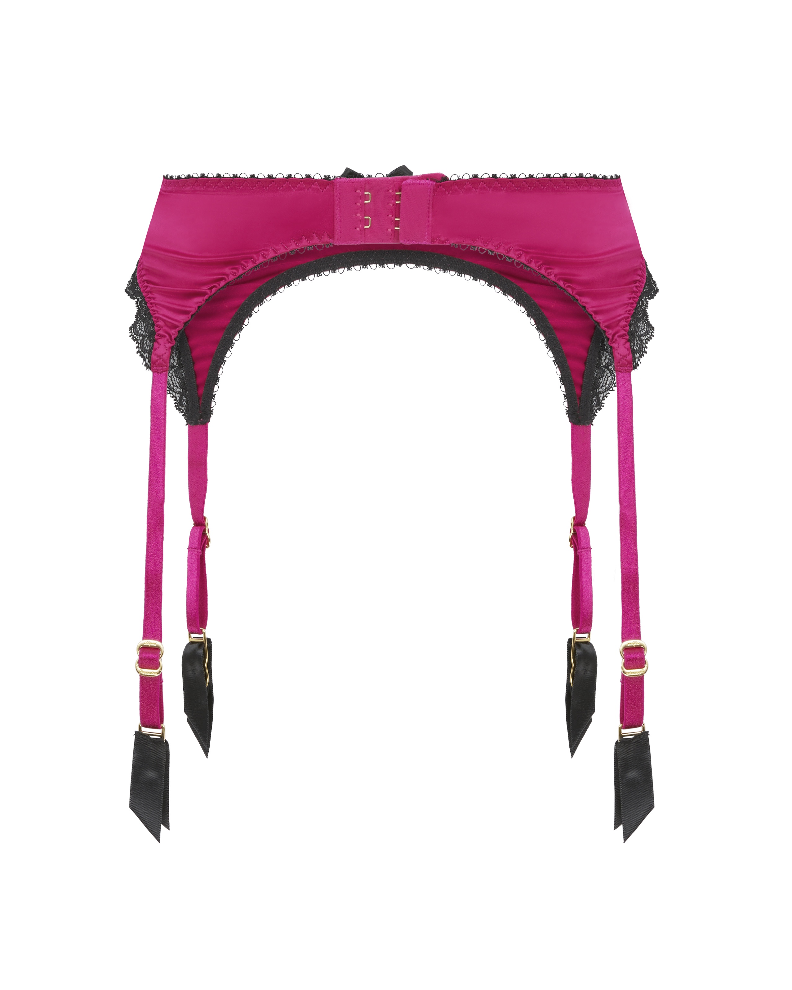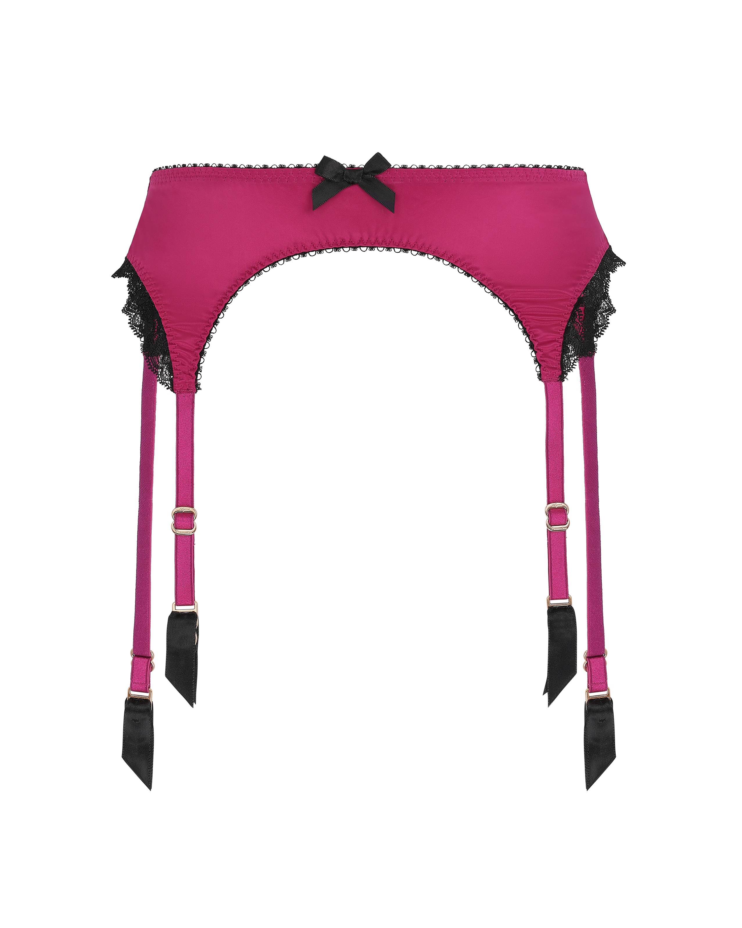 Пояс для чулок цвета фуксия из коллекции Sloane создан из мягкого эластичного сатина, который идеально облегает фигуру. Украшенный черным кружевом и атласными бантиками, пояс дополнен фурнитурой с золотым напылением для изысканного акцента — завершите образ, дополнив его другими изделиями из этой серии.