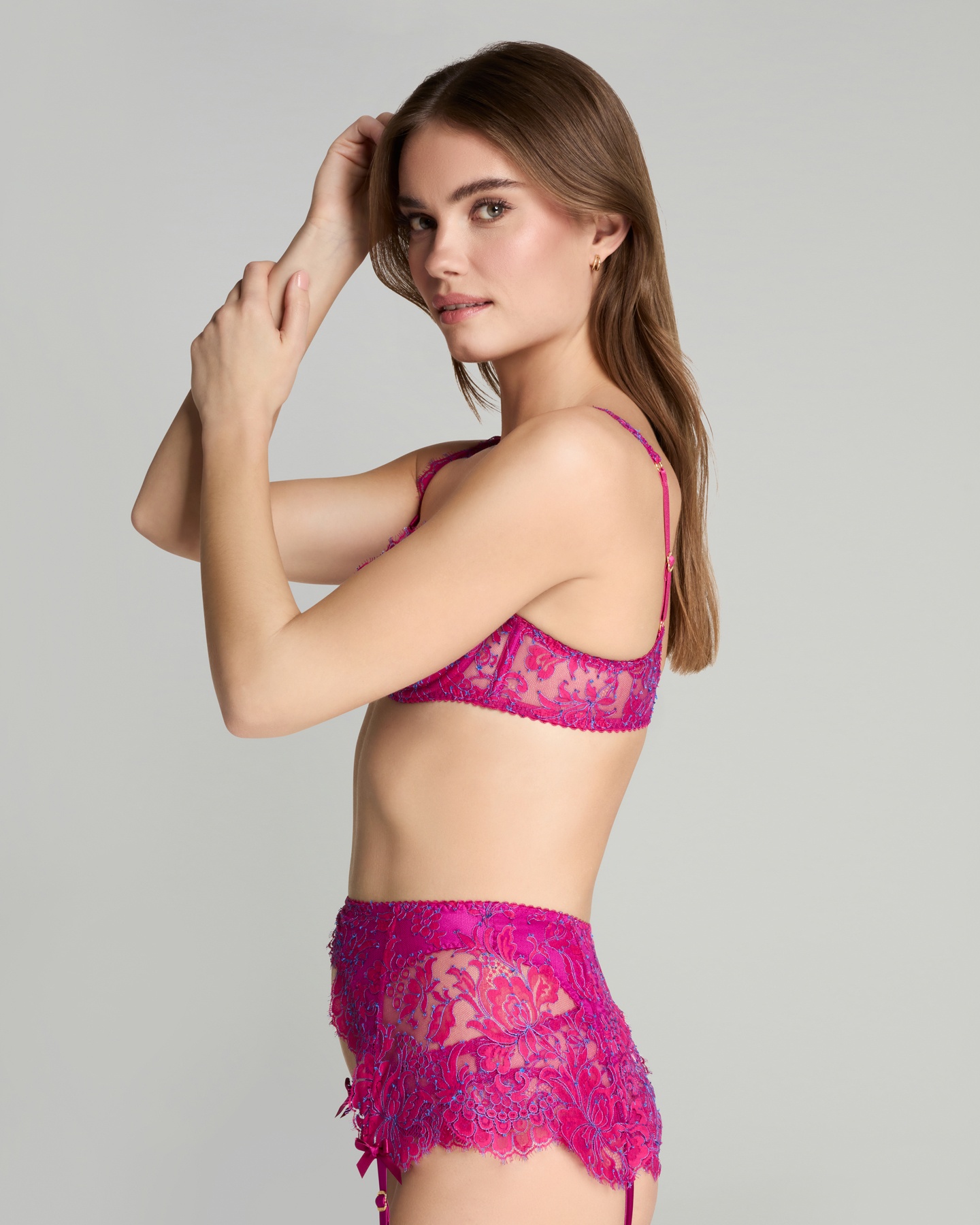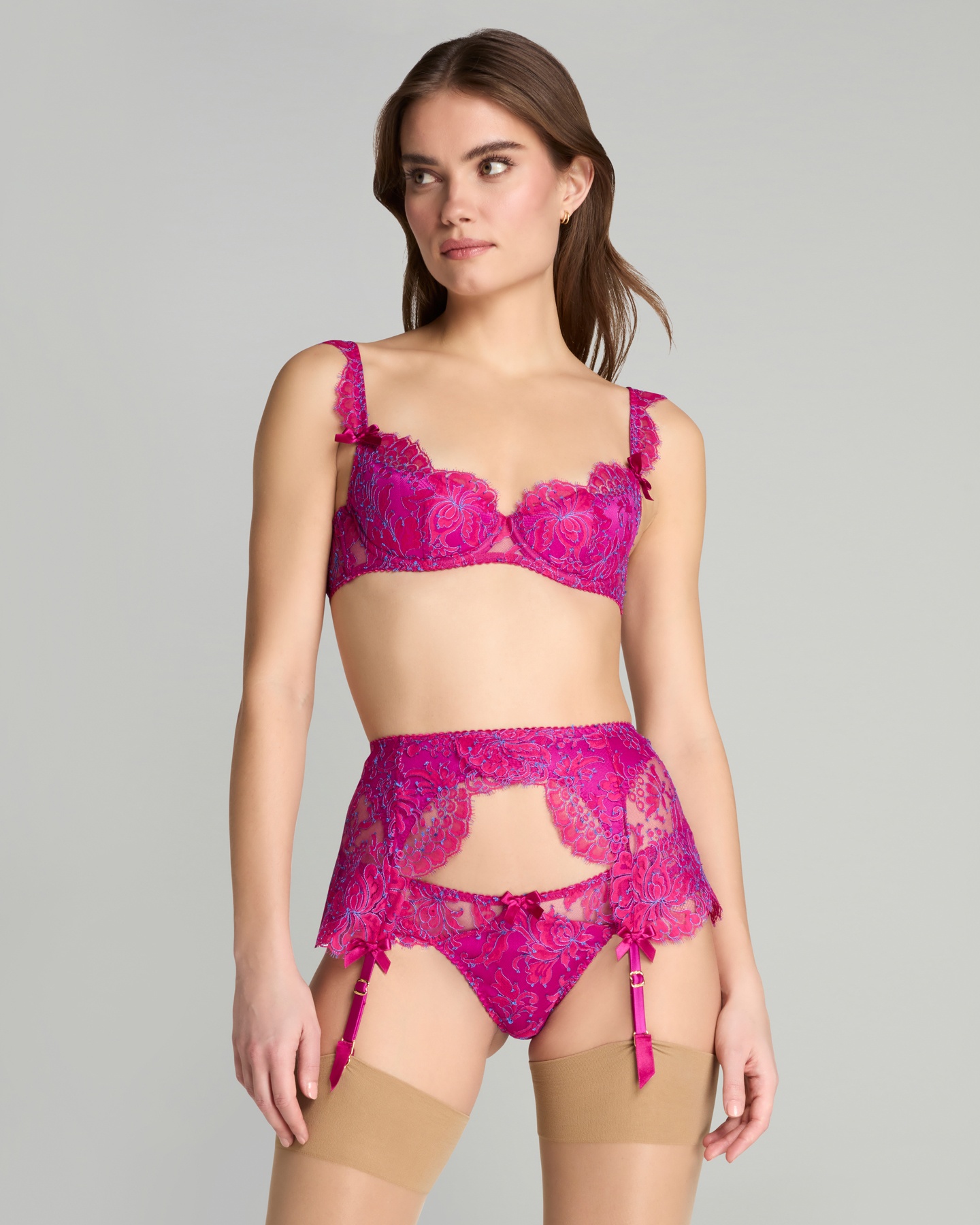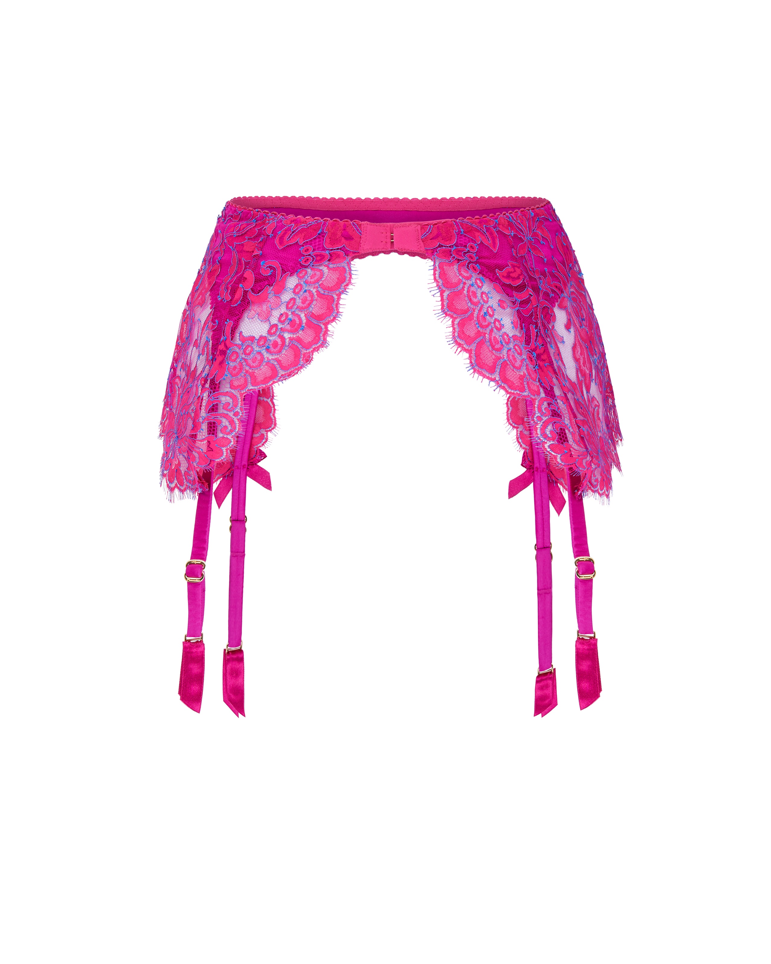 Пояс для чулок цвета маджента из коллекции Emiliana украшен кружевом Leavers с синей отделкой и имеет шелковую подкладку на передней части. Ажурные кружевные вставки кокетливо обрамляют бедра. Застежка на крючки регулируется сзади для идеальной посадки.
