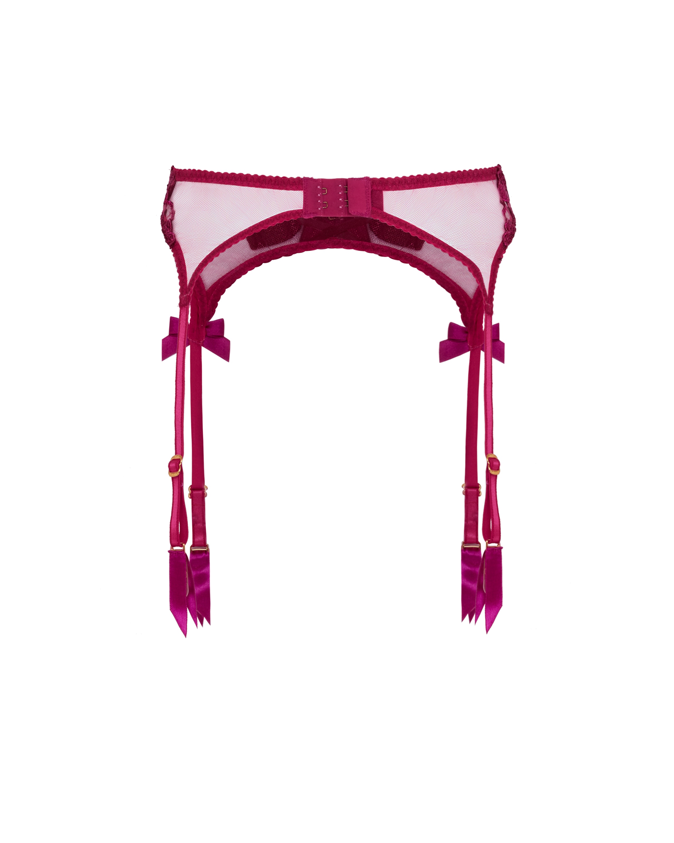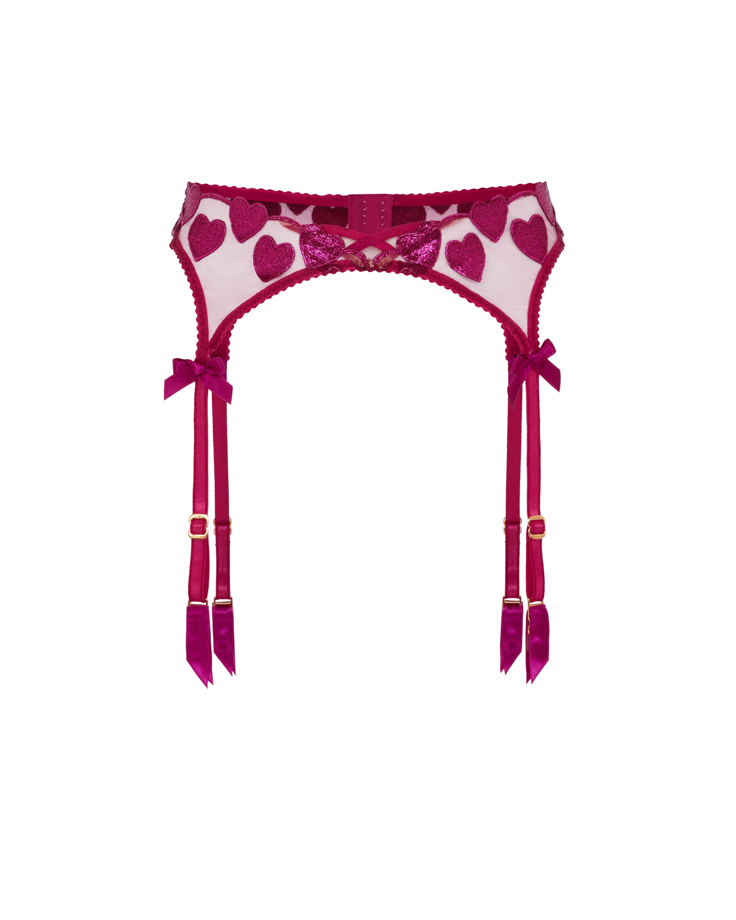 Пояс для чулок Liliya цвета маджента: тюль с искрящимися нитями, золотые элементы и вышитые сердечки. Связующее звено для цельного романтичного образа.