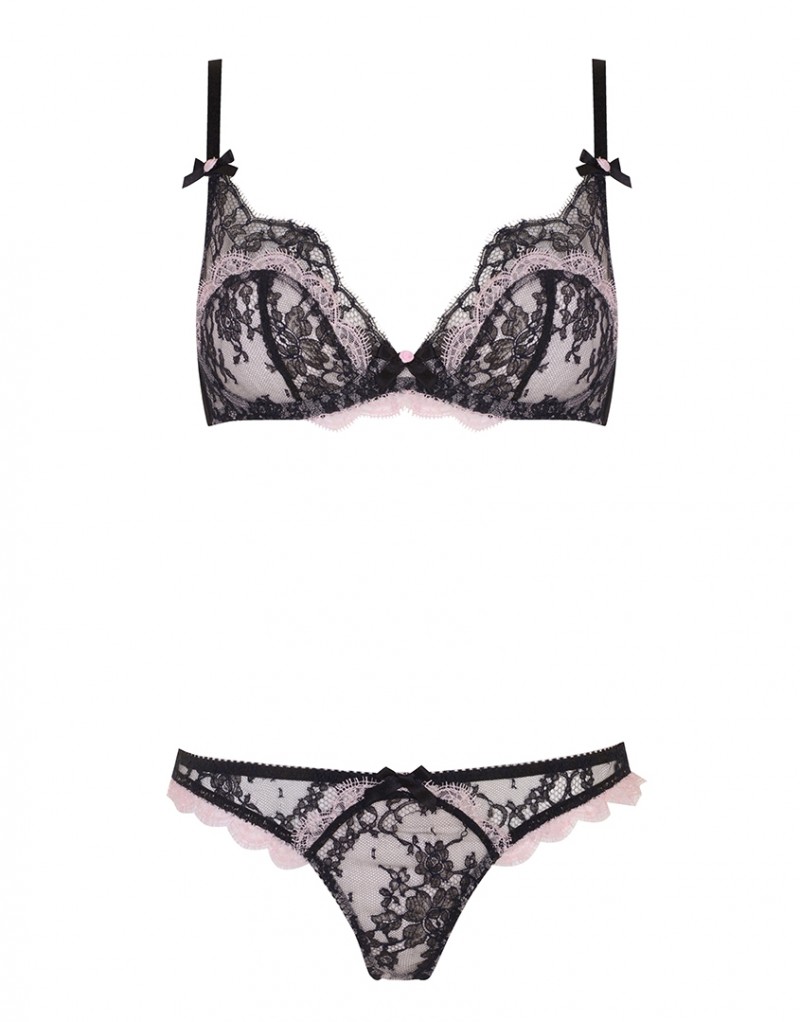 Очаровательная Garcia околдовывает черным французским кружевом и нежно-розовым тюлем. Пояс украшен кружевом и шелковыми бантиками с розовыми бутонами роз. Образ завершают черные пажи с золотистой фурнитурой.