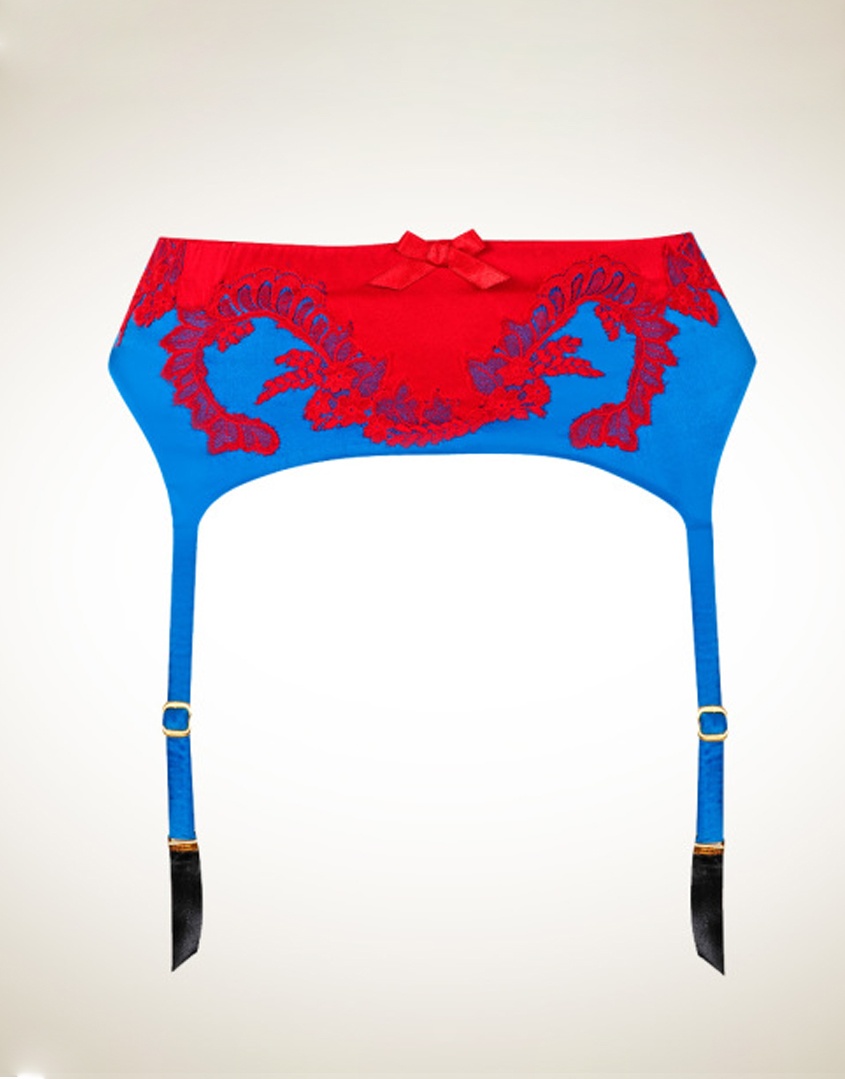 Пояс для чулок выполнен из бирюзового шелкового атласа с контрастной алой шелковой вставкой на талии. Пояс украшен аппликациями из алого французского кружева ливерс ручной работы. Алый бант в центре завершает изысканный образ.