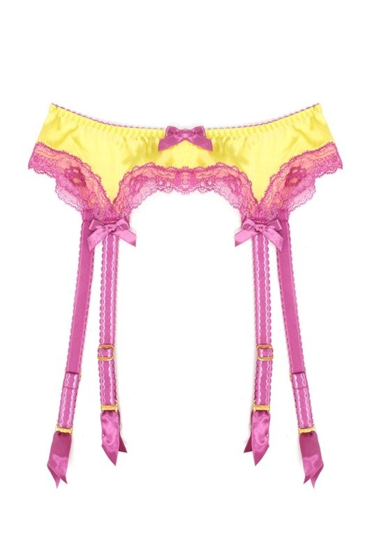 Lucie – потрясающий яркий комплект на основе классической модели Amelea. Этот обольстительный пояс прекрасно дополнит бюстгальтер и трусики Lucie. Выполненный из желтого шелка, он оторочен сиреневым кружевом ливерс вдоль бедер. Эластичные пажи с кружевным краем украшены золотистыми клипсами с логотипом AP. Небольшой сатиновый бантик на талии завершает образ.