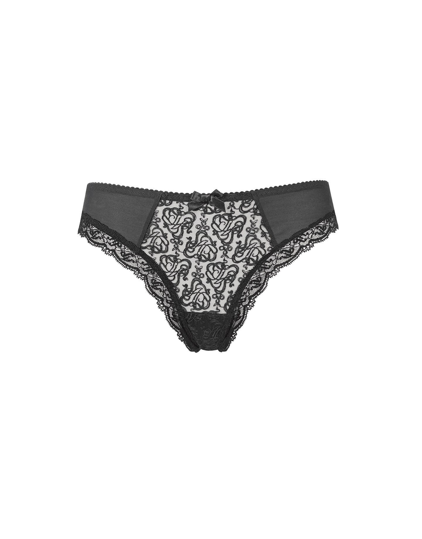 Трусики стринги Mercy из ткани меш украшены панелями с фирменной вышивкой Agent Provocateur спереди и сзади. Сатиновый бантик и кружевная окантовка по линии бедер завершают образ.