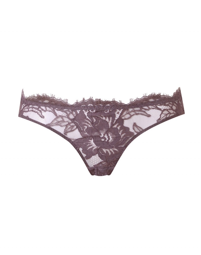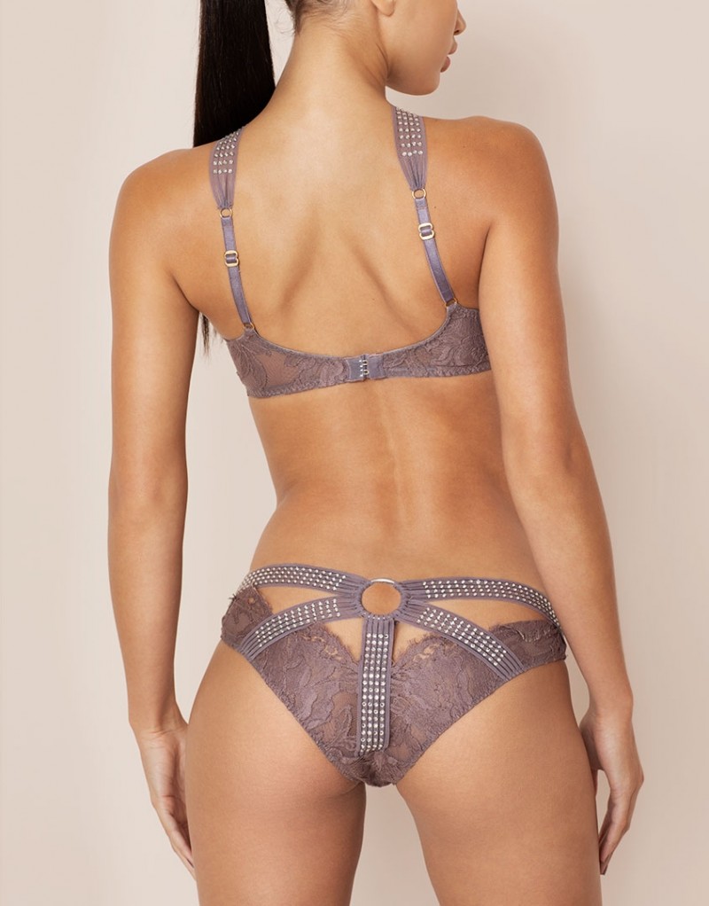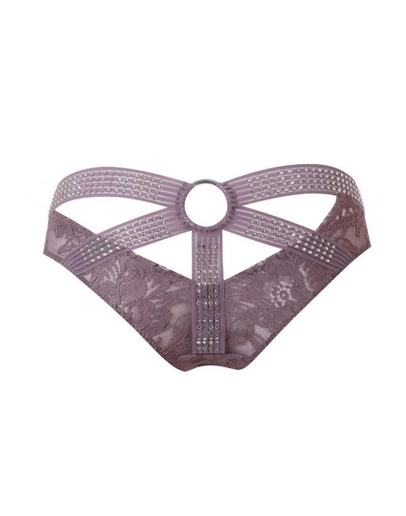 Трусики выполнены из полупрозрачной ткани, декорированной сиреневым кружевом. Разрез сзади украшен широкими лентами со стразами, которые соединяются в центре с помощью металлического кольца.