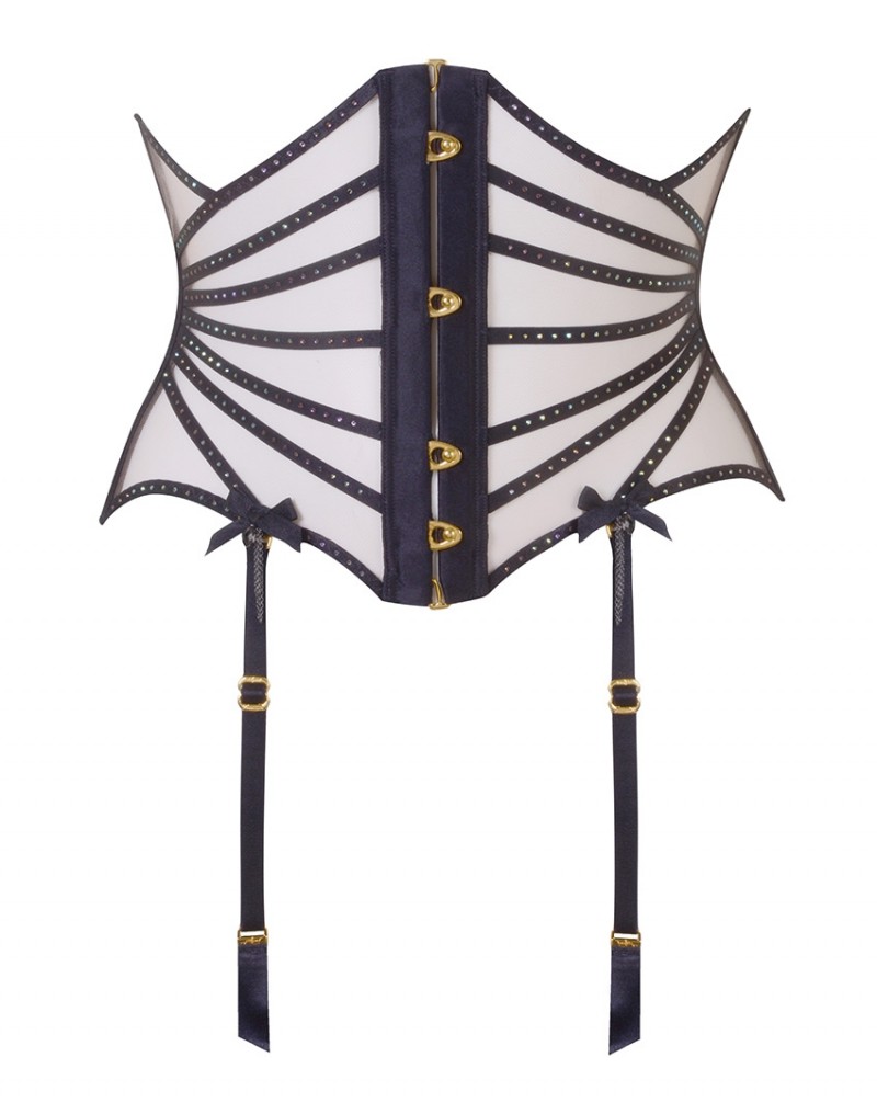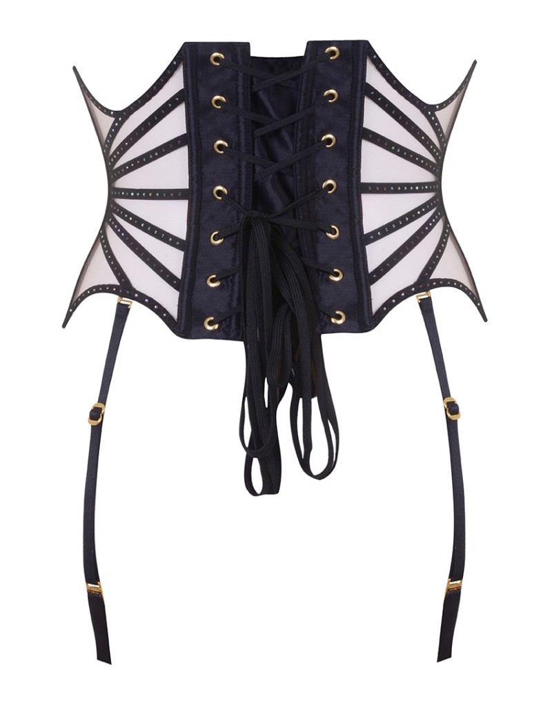 Модель выполнена из фигурных черных ремешков, которые обрамляют тело от линии груди и до линии бедер. Ремешки украшены рядами миниатюрных кристаллов Swarovski. Сзади пояс завязывается на традиционную шнуровку для идеальной посадки.