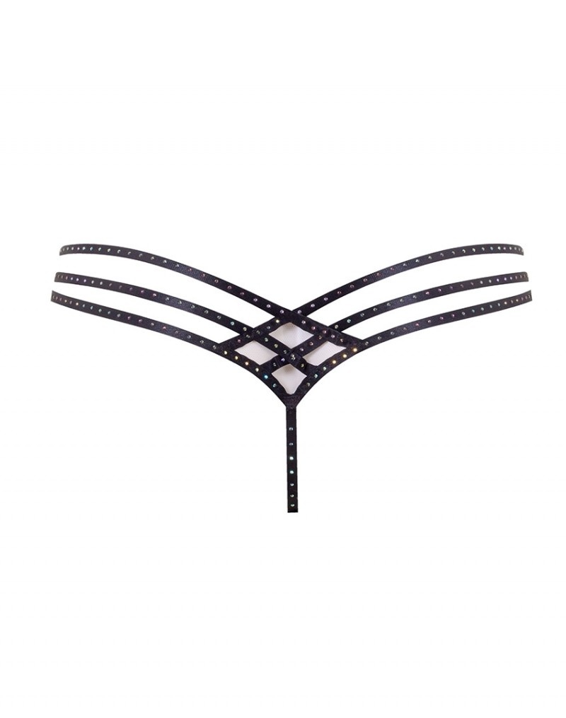 Провокационные трусики выполнены из прозрачной ткани с черными ремешками, декорированными цепочками и миниатюрными кристаллами Swarovski. Ремешки перекрещиваются сзади и формируют изящные вырезы.