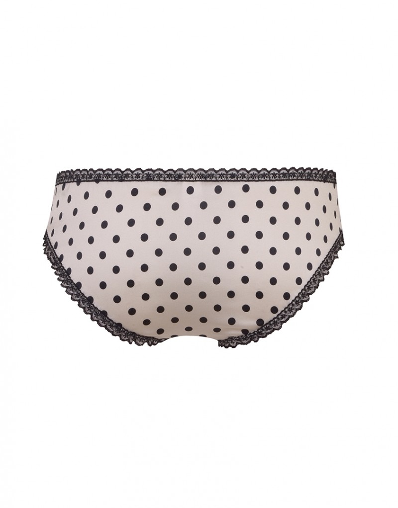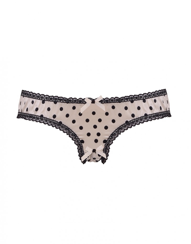 Французские трусики в однотонный горох дополнены черной кружевной тесьмой по краю и сатиновыми бантиками спереди и сзади. Французские трусики украшены кокетливым разрезом на ластовице.