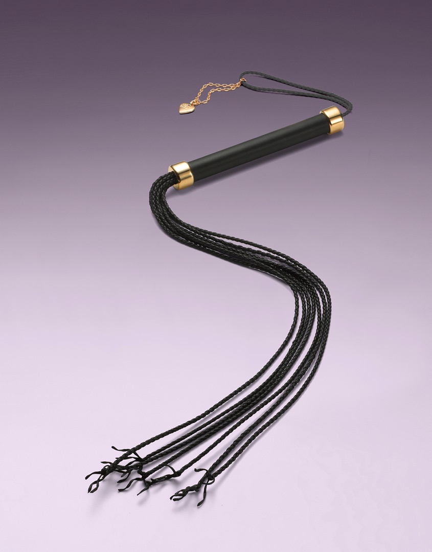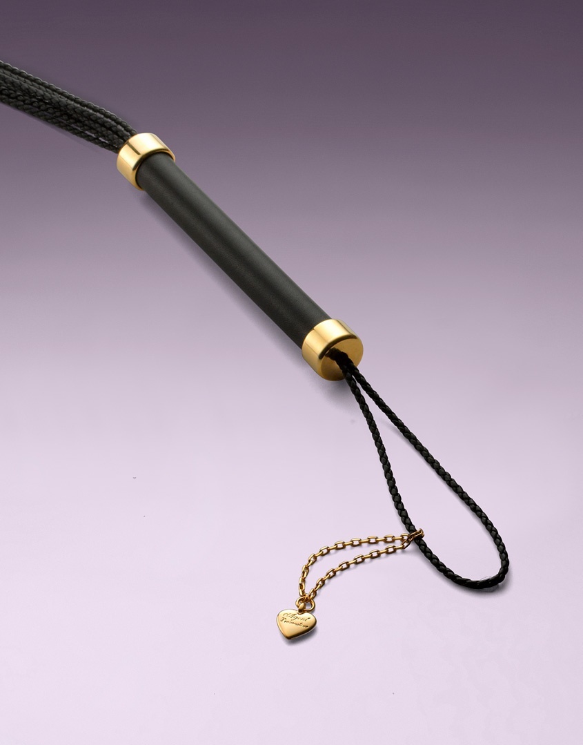 Красивый и роскошный кнут выполненный из 44-сантиметровых переплетеных эластичных кожаных лент, аккуратно связанных на конце. Золотые металлические детали и инициалы АР украшают рукоятку. Пикантный, но роскошный - мяу!