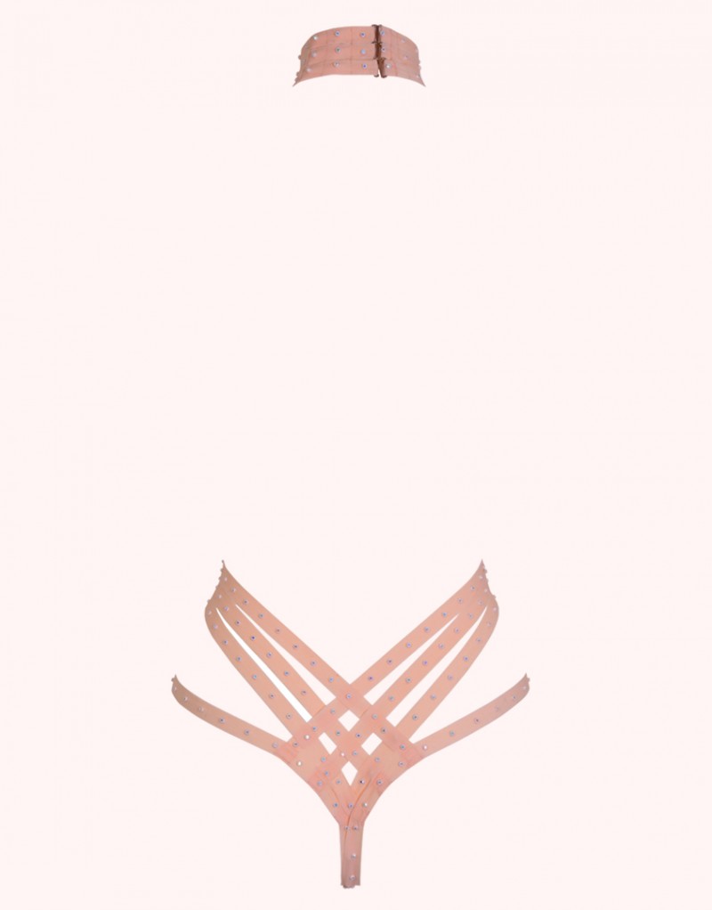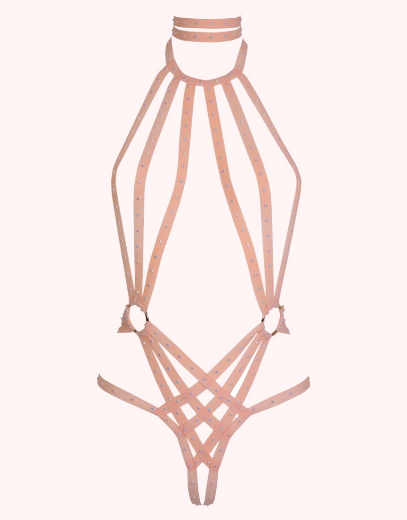 Сексуальное боди из эластичных лент украшено россыпью кристаллов, которые сияют при каждом движении. Ленты оборачивается вокруг тела, подчеркивая соблазнительные формы. Воротник-колье и кольца цвета розового золота завершают сексуальный образ. Прекрасно сочетается с накладками Vanna.