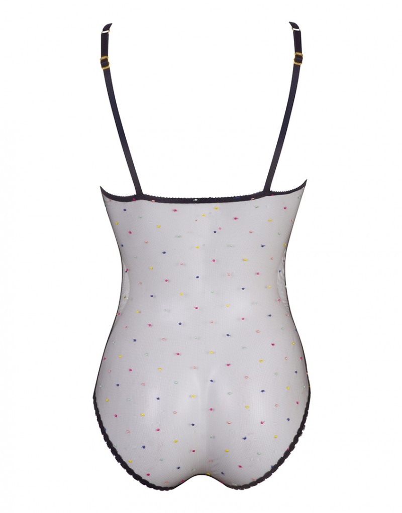 Кокетливая Poppie - коллекция из полупрозрачного тонкого тюля с вышитым контрастным разноцветным узором в горошек. Гладкое черное боди с полукруглым вырезом выполнено в стилистике 1960-х годов. Боди украшено черной кружевной оторочкой вдоль линии декольте и бедер и черными бантиками. Образ дополняют остегивающиеся пажи. Забавная, классическая модель, которая найдет место и в дневном, и в вечернем гардеробе.