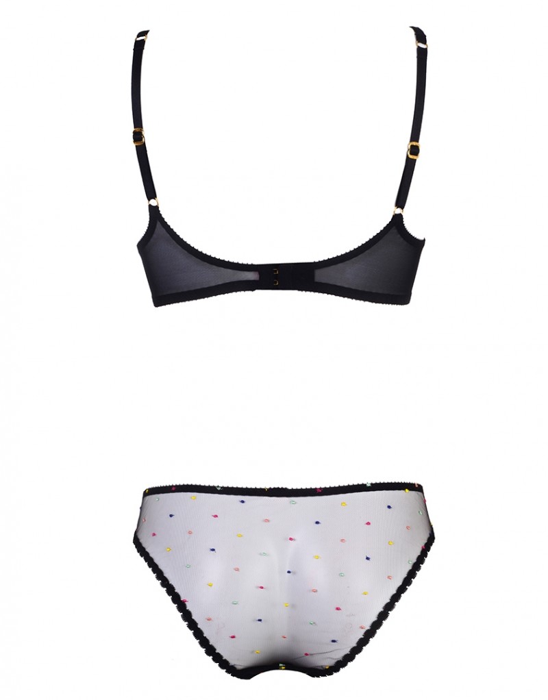 Смелая кокетливая Poppie - новая коллекция из полупрозрачного тонкого тюля с вышитым контрастным узором. Классические трусики черного цвета украшены черной кружевной оторочкой, которая прекрасно сочетается с узором в горошек. Черный бантик с красным бутоном в центре завершает образ.