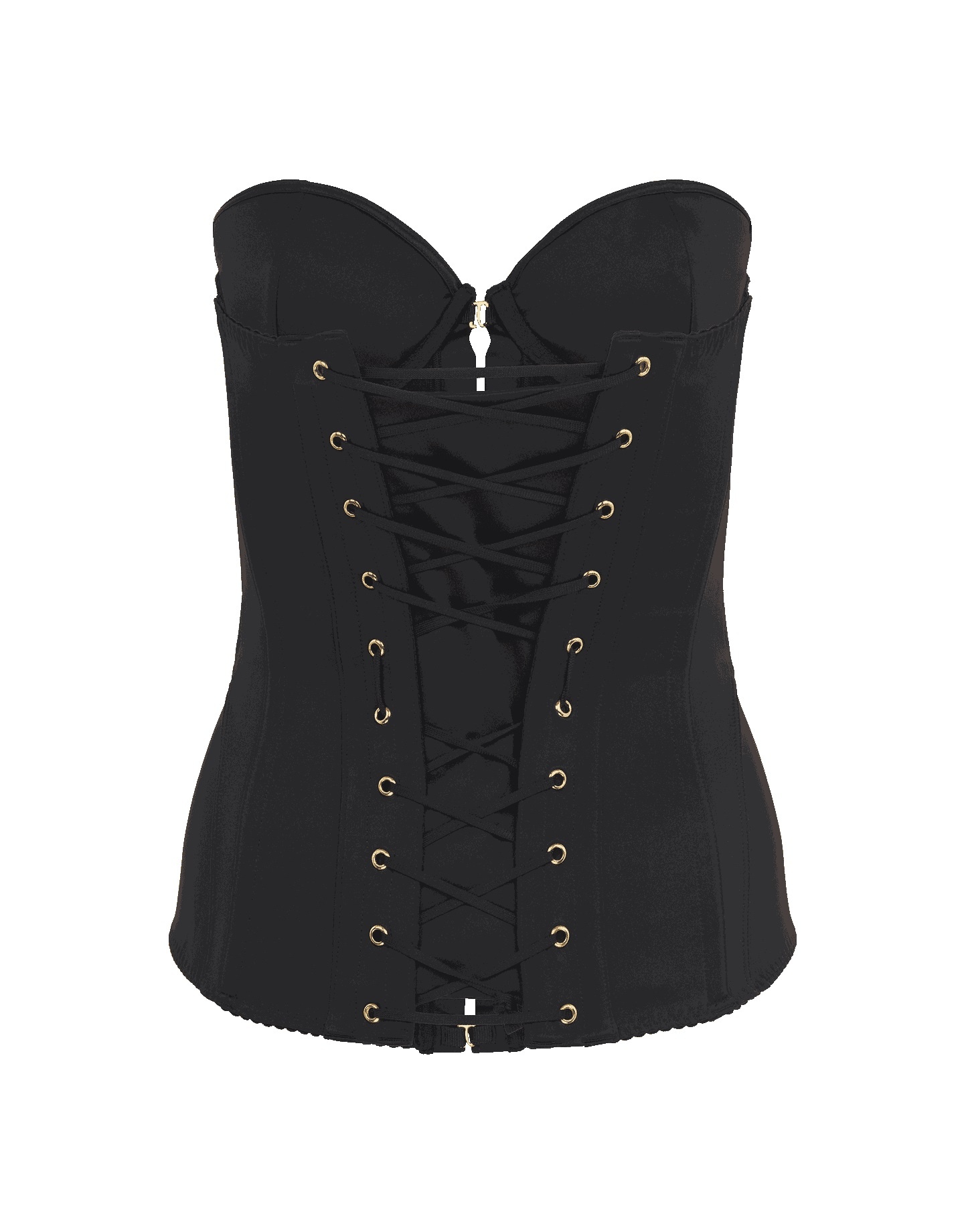Настоящая классика, роскошный сатиновый корсет с косточками Mercy, позволит вам контролировать каждый изгиб вашей фигуры. Чашечки с эффектом push up подчеркивают грудь и обеспечивают необходимую поддержку. Традиционная корсетная шнуровка и продольная застежка на золотистые крючки завершают образ. Носите корсет с трусиками стрингами Mercy.