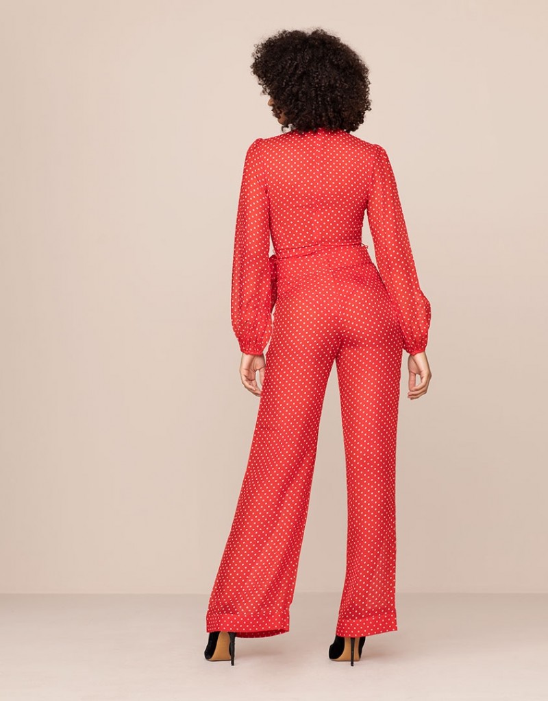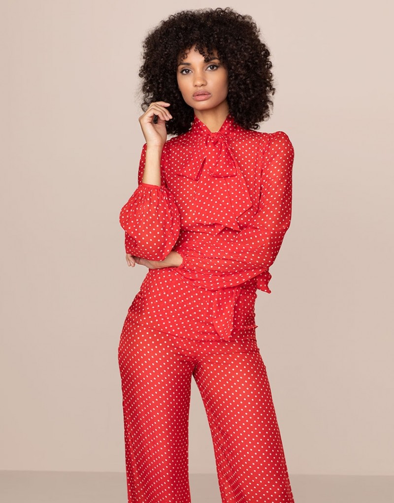 Винтажная и элегантная коллекция Pennie с принтом в горошек стирает границы между одеждой для дома и одеждой на выход. Изысканные длинные брюки с широкими штанинами из легчайшего шифона прекрасно сочетаются с боди Pennie.