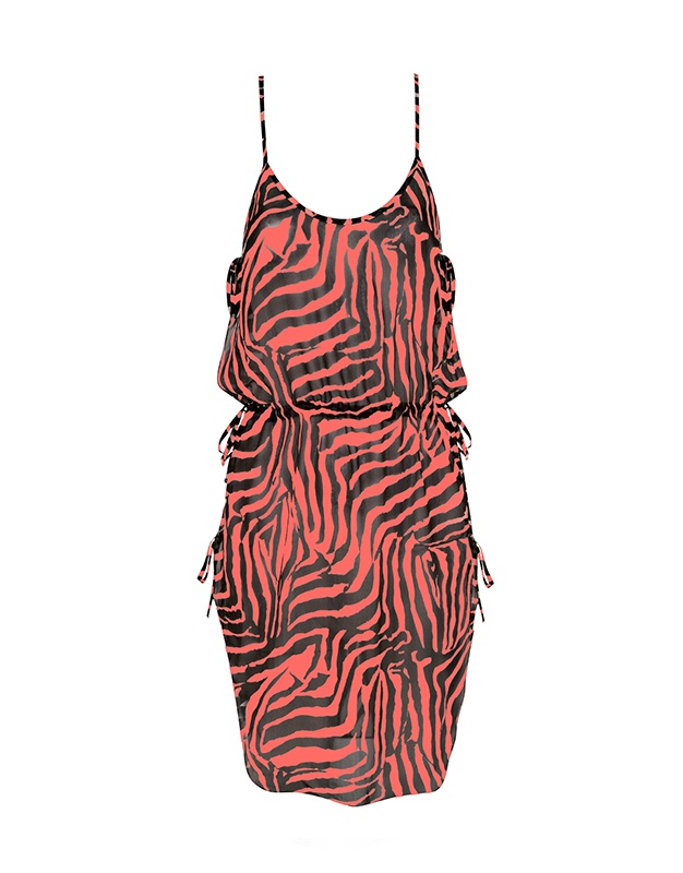 Продемонстрируйте свой хищный нрав в пляжной коллекции Tori тигровой расцветки. Накидка неоново-кораллового цвета на изящных тонких бретелях с низкой линией декольте и регулируемым шнурком на талии наполнит отдых яркими моментами.