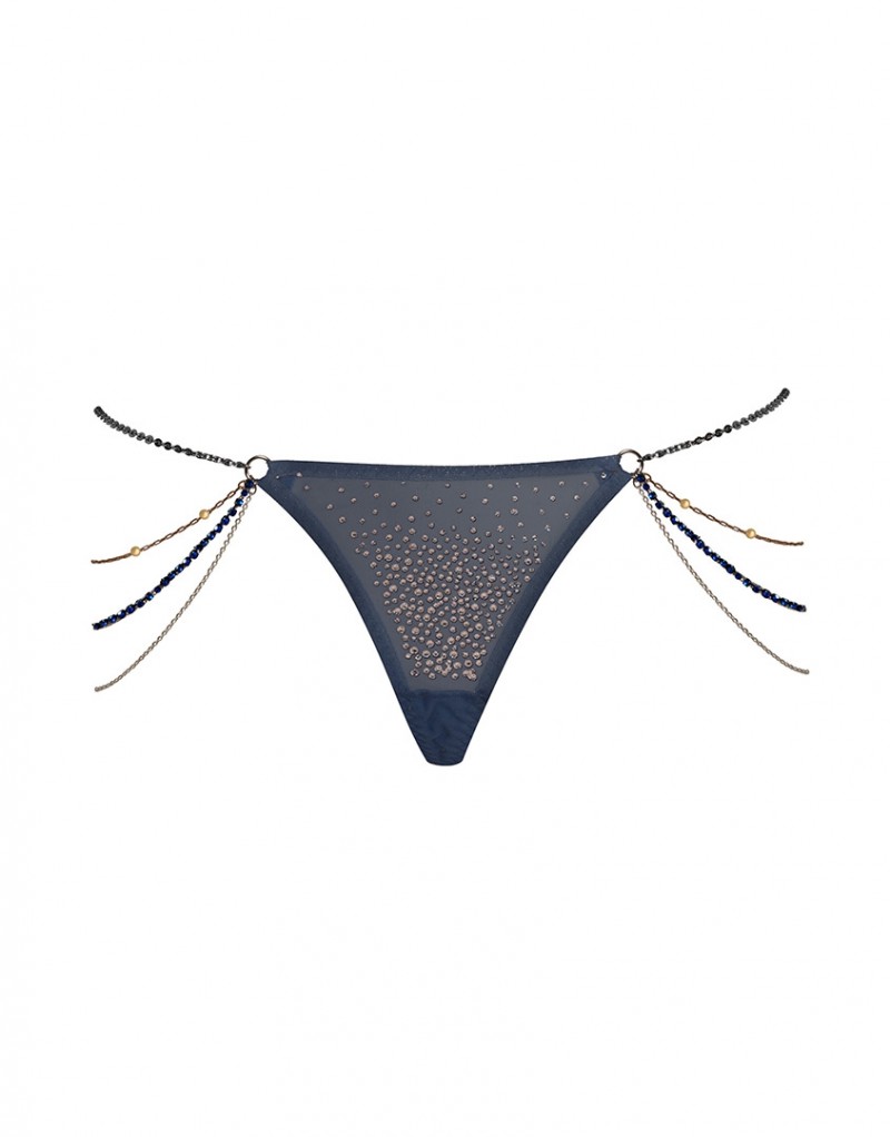 Воплощение гламура в стиле Студии-54, вызывающе эротичные трусики стринги Ulara дополнены передней панелью из тюля, украшенной кристаллами. Подвески из кристаллов Сваровски, золотые и бронзовые цепочки ниспадают на бедра.