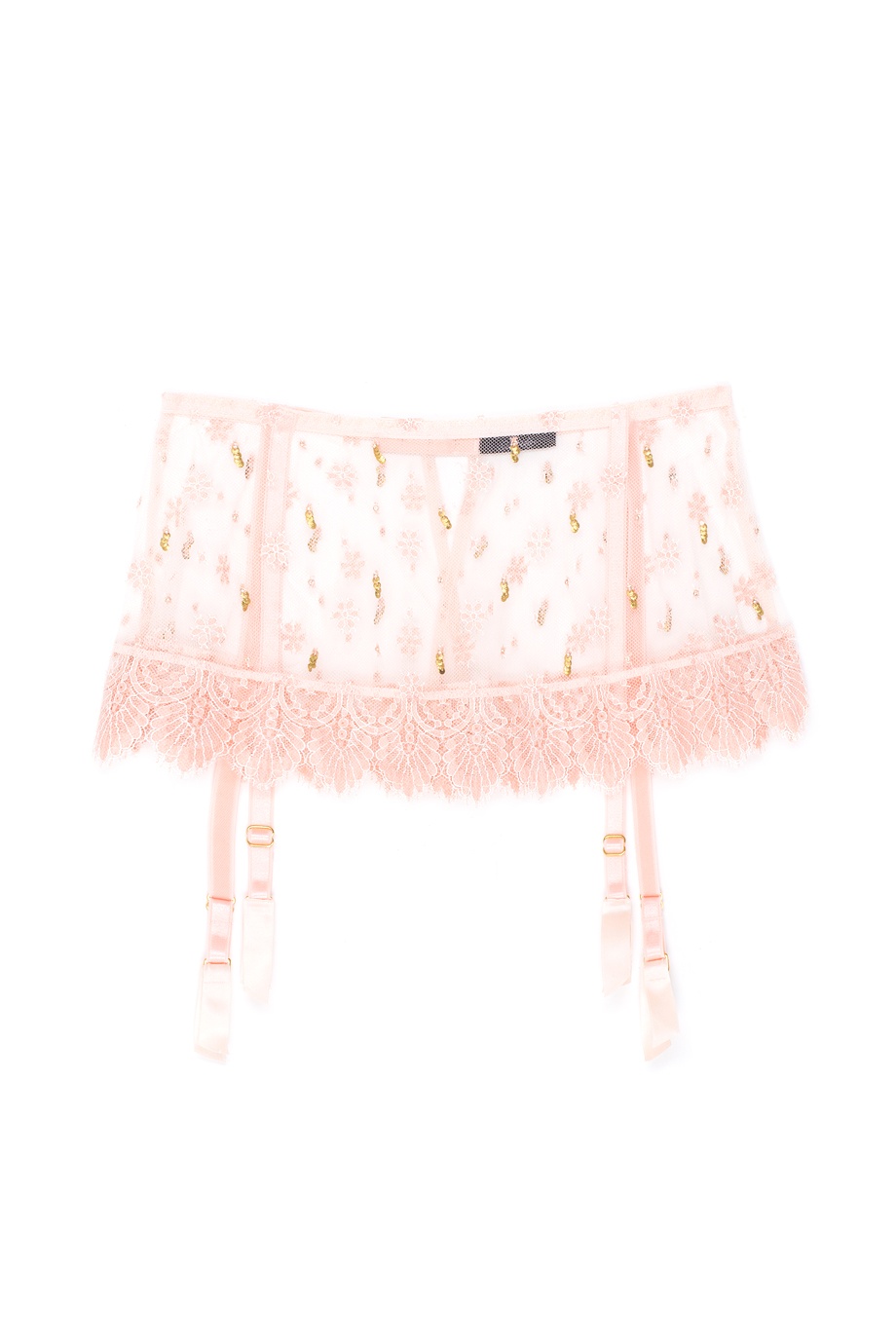 Пояc-юбка Lyalya выполнен из нежного французского кружева ливерс цвета чайной розы и украшен золотистыми пайетками и россыпью кристаллов Swarovski. Кружевная отделка завершает изысканный и романтичный образ этой модели. Дополните комплект подходящими по цвету чулками под пояс Seam & Heel Stretch