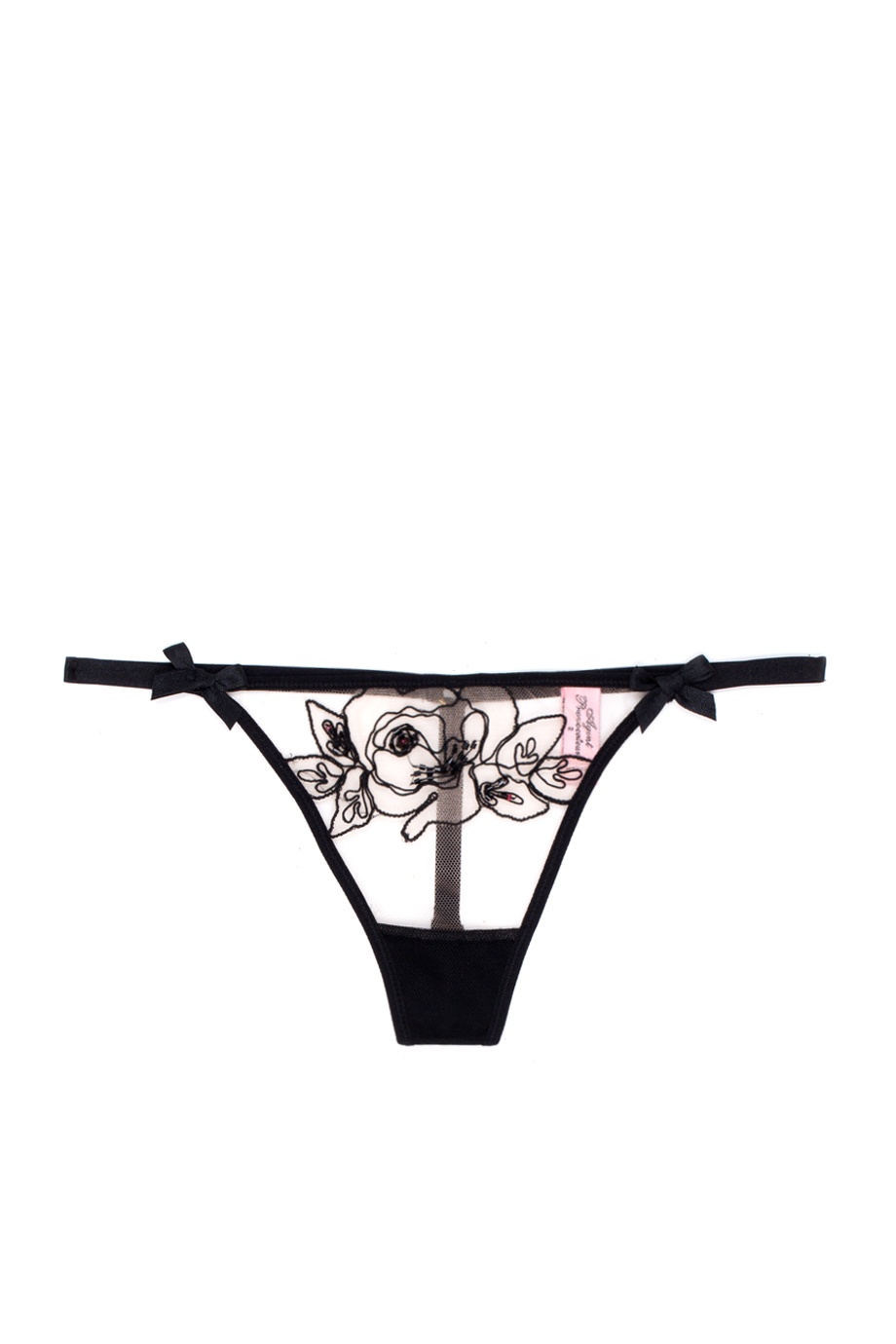 Озорной, роскошный и манящий комплект Lindie украшен изысканным флоральным кружевом, вышитом на прозрачном итальянском тюле. Узоры кружева подобны татуировке на обнаженном теле. Трусики-стринг с низкой посадкой декорированы ручной вышивкой из черного и красного стекляруса. Черные эластичные лямки сзади украшены маленьким золотым кольцом. Матовые черные бантики с розовыми бутонами, украшенными стеклярусом, завершают образ. Дополните комплект подходящими по цвету чулками под пояс Seam & Heel Nylon