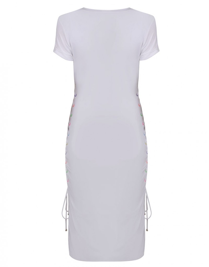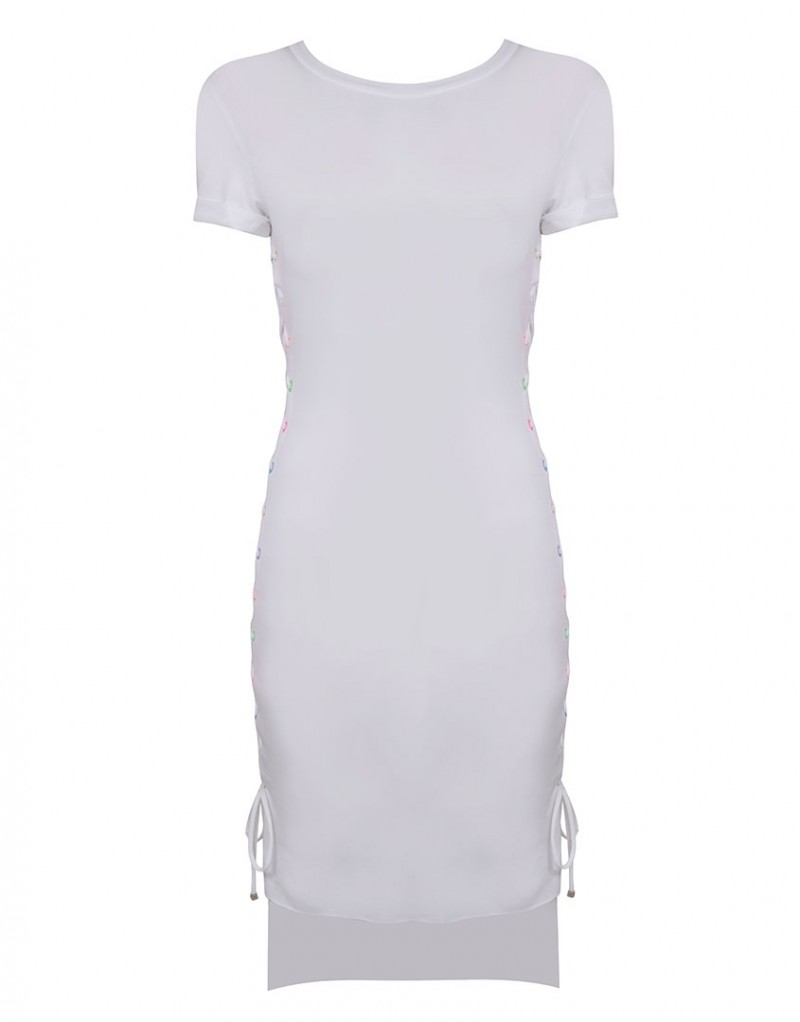 Ваше настроение будет игривым, как никогда, с беспечной Marney. Белое платье с короткими рукавами и асимметричным подолом, коротким спереди и удлиненным сзади, украшено разноцветными неоновыми люверсами и шнуровкой. Детали: платье идеально сочетается с бикини и купальником Marney. Материалы и уход: 94% модал, 6% эластан. Рекомендована ручная стирка.