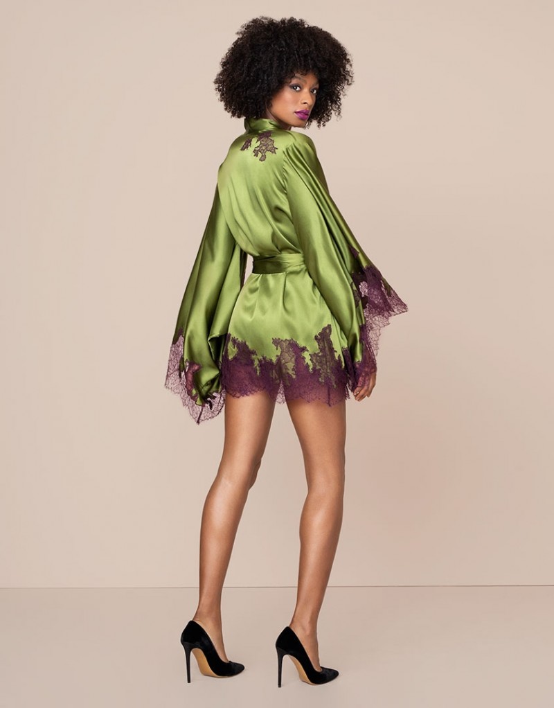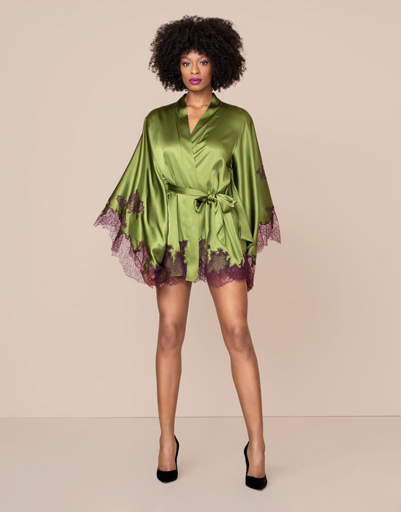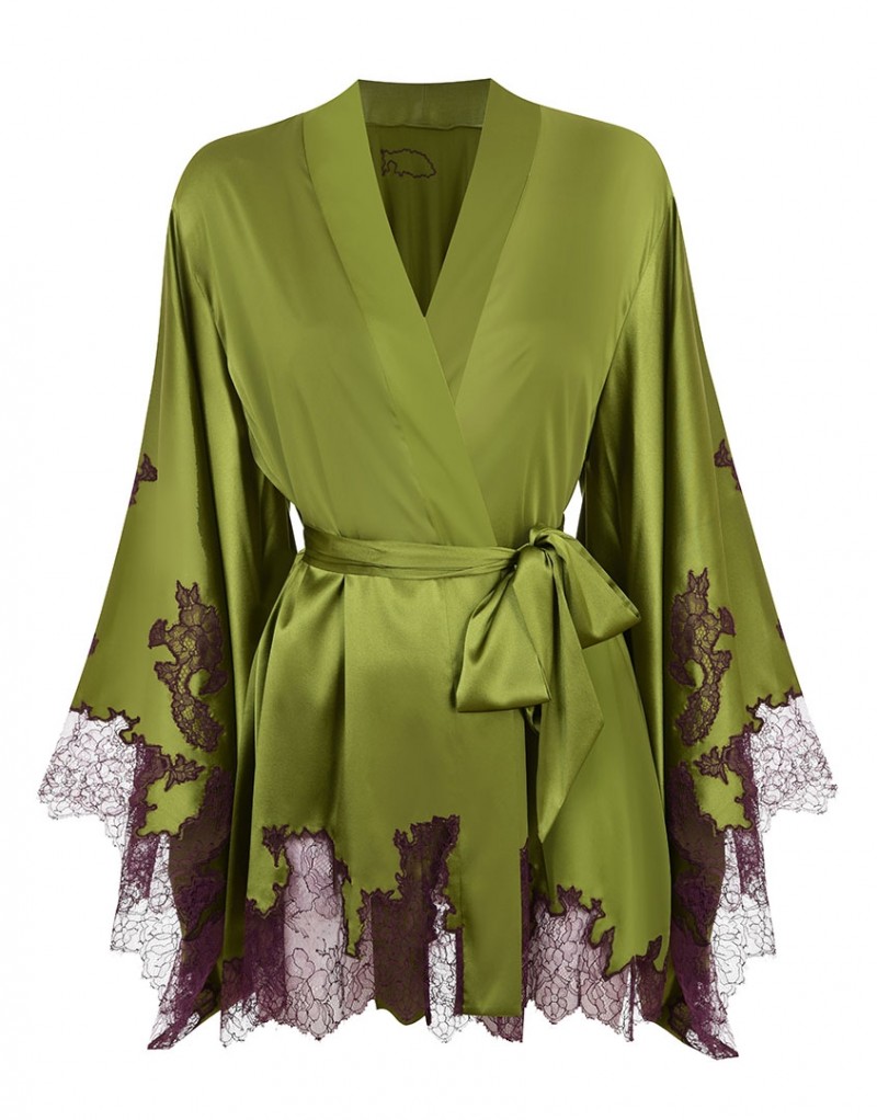 Christi – воплощение вечной романтики. Укороченный халат-кимоно роскошного оливкового цвета выполнен из натурального шелка. Модель с коротким подолом декорирована элегантным и изысканным цветочным кружевом контрастного сливового оттенка. Детали: сочетайте с коллекцией Christi. Широкие рукава и пояс. Материалы и уход: 94% шелк, 6% эластан. Кружево: 66% полиамид, 34% хлопок. Только сухая химчистка.