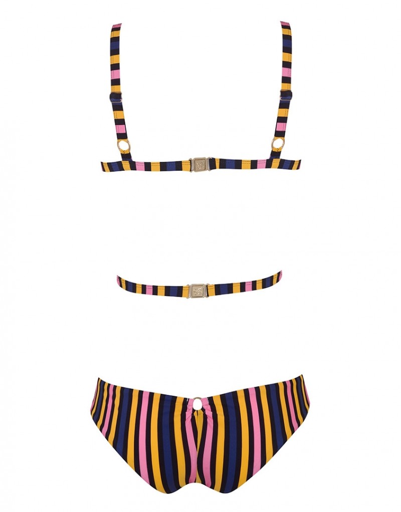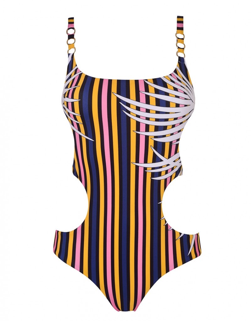 Понежьтесь на солнышке в Malisa. Этот слитный купальник сразу привлекает внимание благодаря эффектным вырезам по бокам, которые подчеркивают каждый изгиб. Купальник украшен оригинальным принтом Agent Provocateu в полоску с пальмовыми листьями и дополнен золотистой фурнитурой. Детали: изготовлено из гладкой бесшовной ткани. Без косточек.