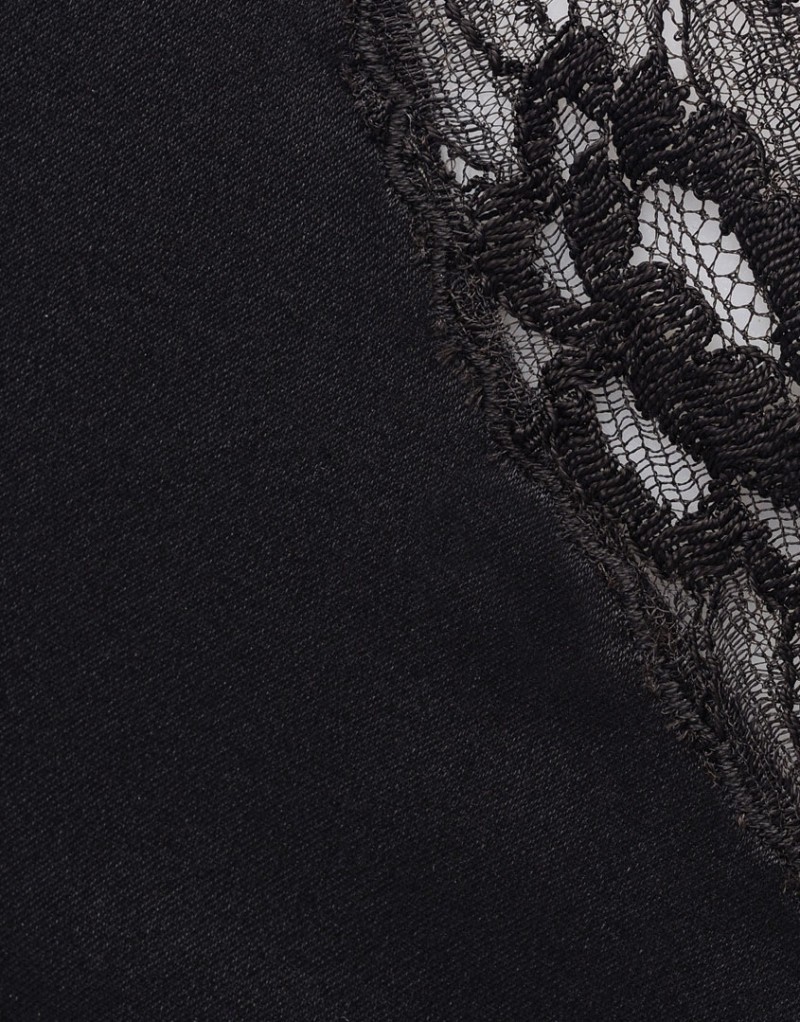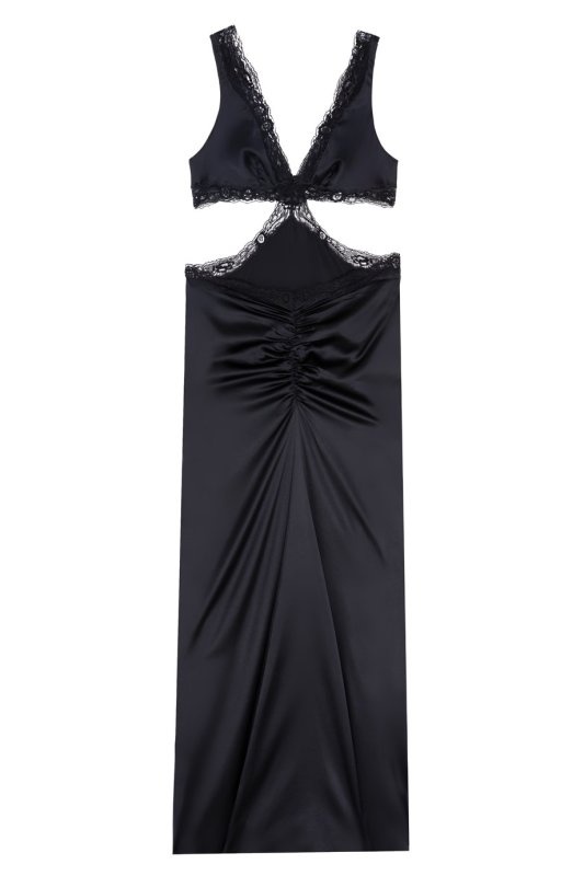 Бесстыдно чувственное платье Michelle выполнено из роскошного черного шелка. Очаровательный силуэт в стиле 70-х, глубокое декольте, вырезы по бокам и оторочка французским кружевом ручной работы произведут незабываемое впечатление. Мягкий шелковый лиф с треугольными чашками застегивается сзади на маленькие сатиновые пуговицы. Вырезы по бокам плавно переходят в глубокое декольте на спине. На ягодицах платье слегка присборено. Образ завершает невесомый черный шлейф. Элегантное платье Michelle подойдет и для вечернего выхода, и для ужина при свечах дома. Оно выглядит еще более соблазнительно в сочетании с комплектом цвета охры Leisa.