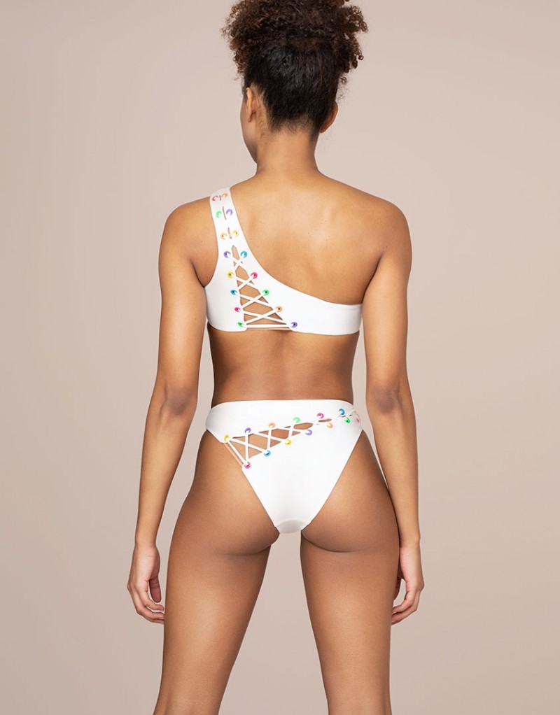 Будьте игривы, как никогда, вместе с жизнерадостной Marney. Белый бюстгальтер бикини с асимметричным дизайном на одно плечо украшен разноцветными неоновыми люверсами и дерзкой шнуровкой поверх прозрачного тюля. Детали: сочетайте с плавками бикини Marney. Материалы и уход: 75% полиамид, 25% эластан. Сетка: 100% полиамид. Рекомендована ручная стирка.