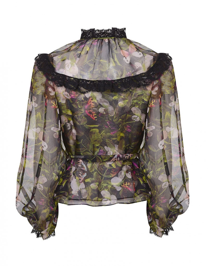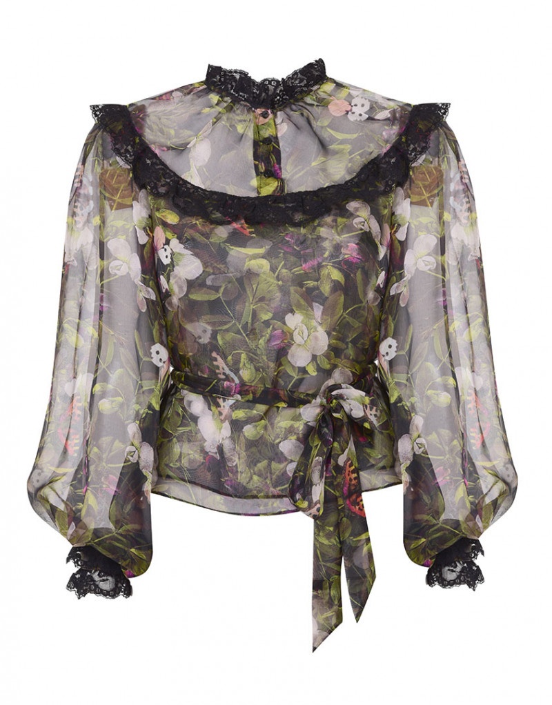 Погрузитесь в мир чувственности с восхитительной коллекцией Annelise, украшенной растительным принтом, навеянным садами Марии Антуанетты. Свободная разноцветная шифоновая блуза с длинными рукавами украшена ажурной кокеткой в викторианском стиле. Оборки из черного кружева и завязки на талии завершают образ. Детали: сочетайте с предметами вашего повседневного и будуарного гардероба. Материалы и уход: 100% полиэстер. Рекомендована ручная стирка.