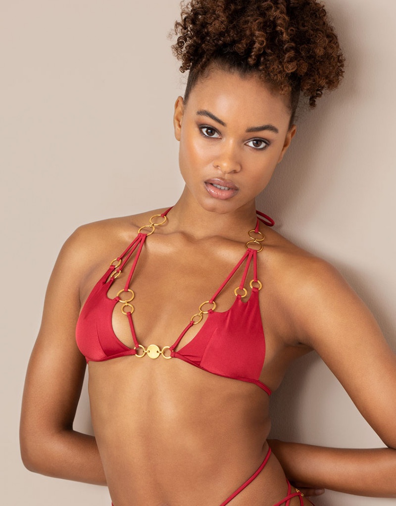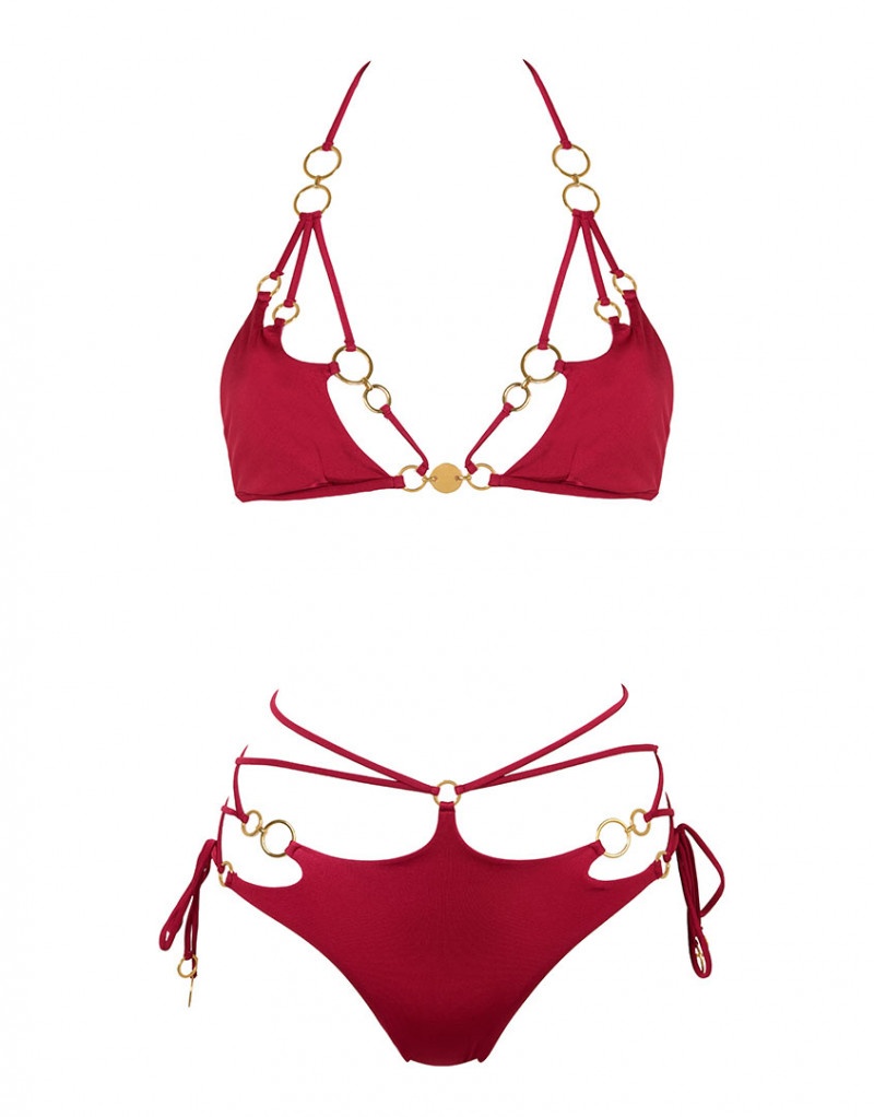 Превратитесь в современную Клеопатру в божественно прекрасной коллекции Davine. Бюстгальтер бикини глубокого красного цвета выполнен из эластичного материала с легким блеском. Тонкие тесемки с очаровательными золотыми кольцами и дисками завершают образ.