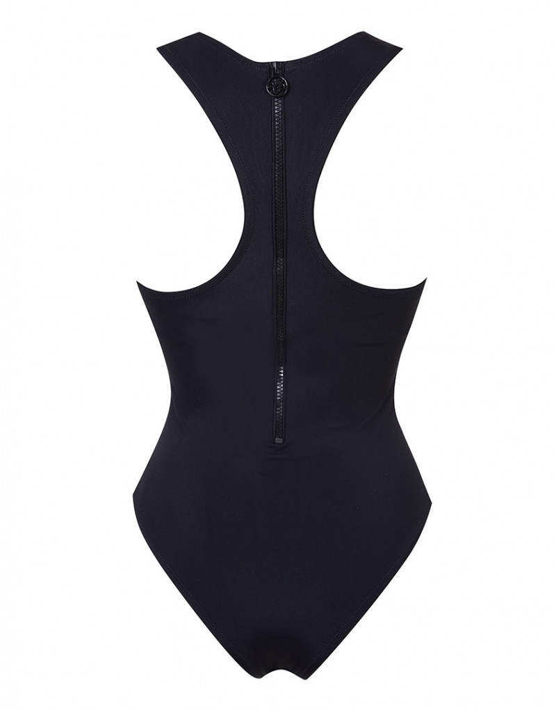 Представляем Odie: современную, завораживающую и беззастенчиво сексуальную. Черный слитный купальник с чашками на косточках и высоким воротом украшает сексуальный поперечный вырез по нижней части груди. Купальник дополнен съемным черным ремнем.