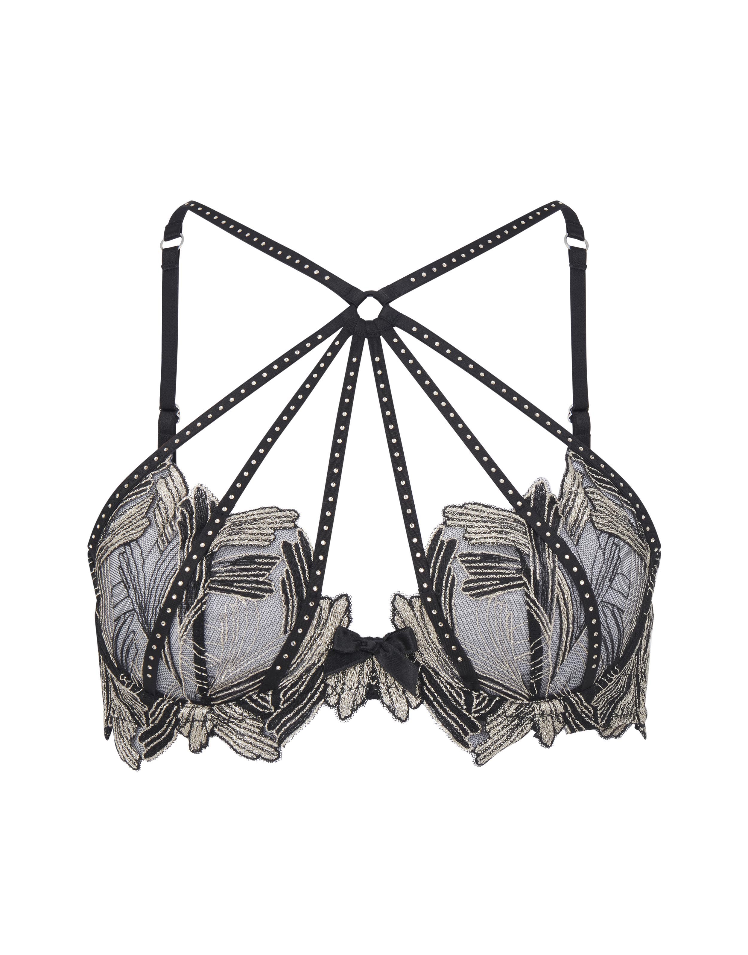Дизайн этого бюстгальтера из линейки Christalina вдохновлен гламурным стилем ар-деко. Отсюда и сложный, сочетающий в себе геометрию и растительные мотивы, орнамент с вышивкой золотистым люрексом. Ключевым элементом стали тонкие лямки с блестящими кристаллами Swarovski. Модель с мягкими чашечками на поддерживающих косточках.
