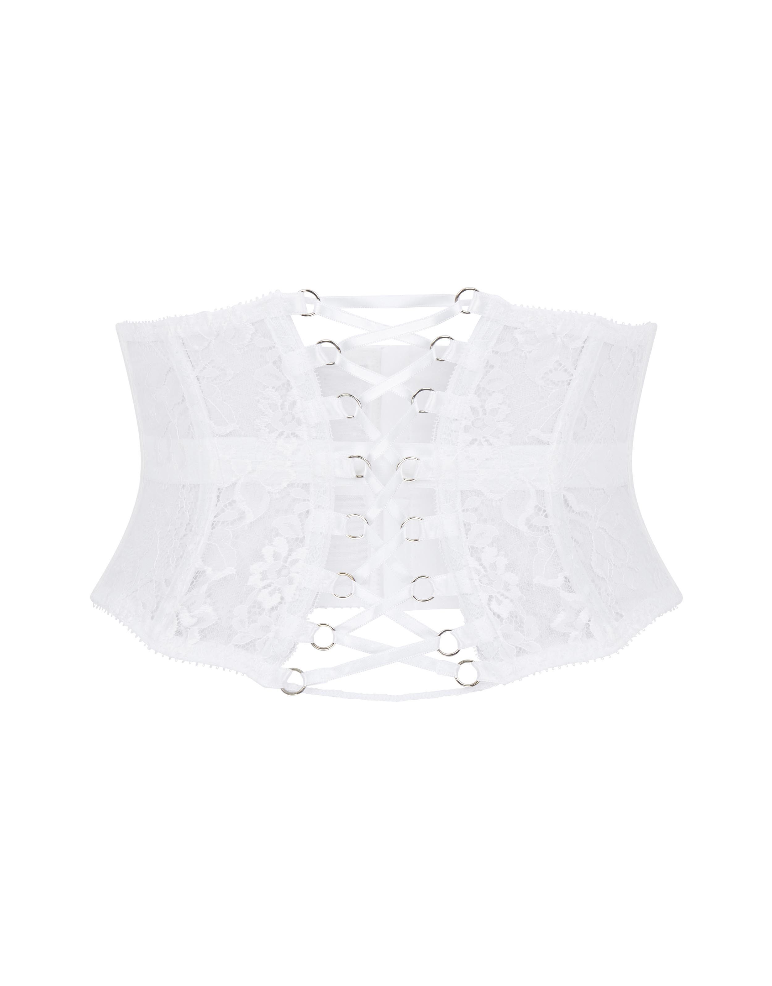 Идеальным дополнением романтического комплекта Essie станет этот корсетный пояс из тонкого белого кружева с цветочными узорами. Модель на косточках дополнена плотным материалом сзади, что наделяет пояс моделирующим эффектом. Центральная часть украшена атласной шнуровкой. Застежка на крючки сзади.