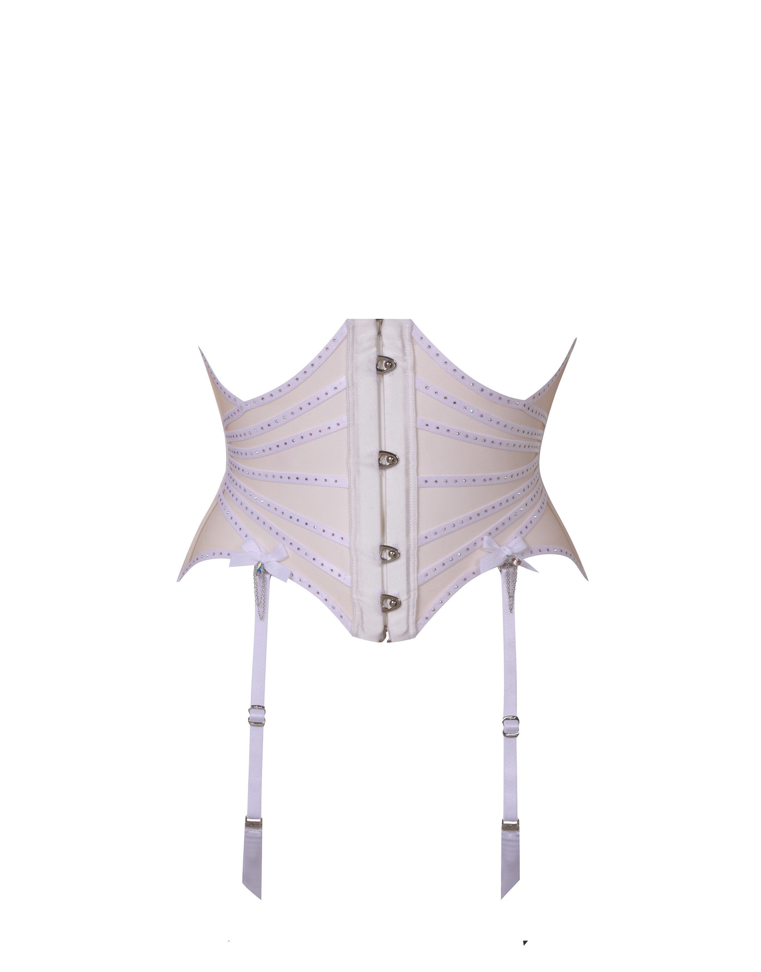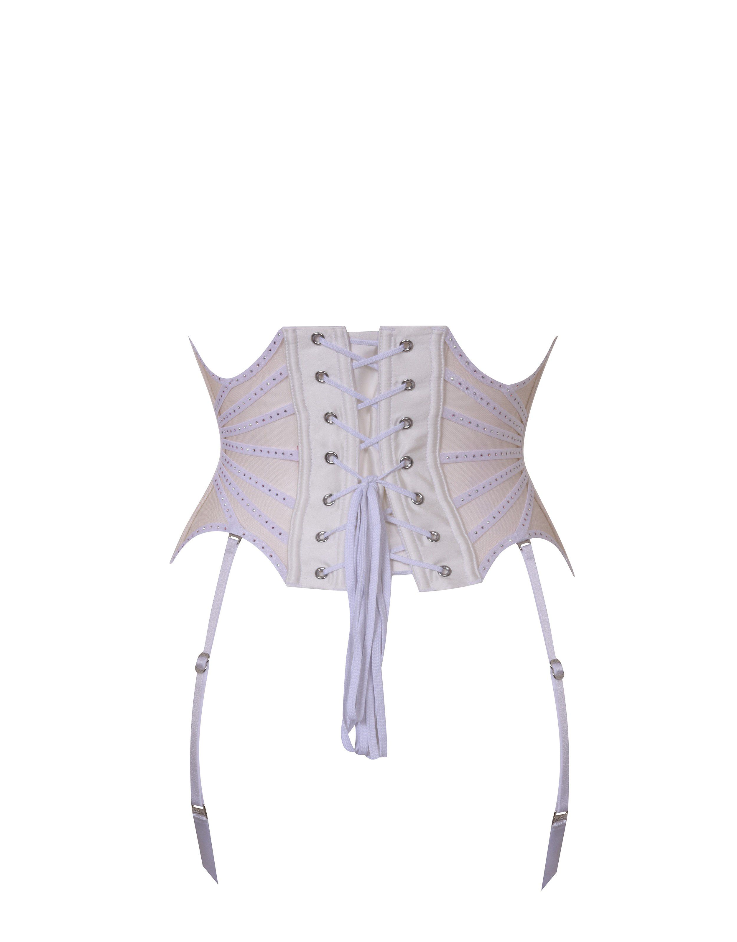 Пояс Rubi может стать ключевой деталью образа в стиле Agent Provocateur. Дизайн модели воплощает одну из главных идей бреда - создать эффект ритмичных вырезов, подчеркивающих соблазнительные изгибы тела. Модель на жестких косточках белого цвета, которые украшены кристаллами Swarovski и соединены телесной сеткой. Спереди крючки, а сзади массивная шнуровка.